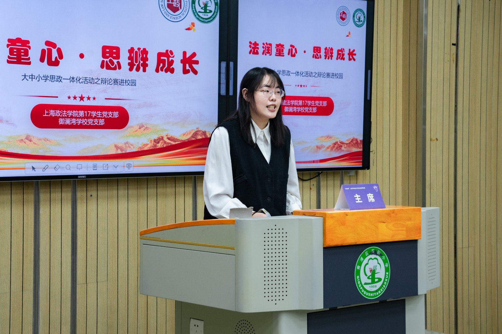 为推动大中小学思政一体化建设走深走实,搭建校地党建联动育人桥梁,2025年12月16日,上海政法学院第17学生党支部与御澜湾学校党支部联合举办“法润童心·思辨成长”辩论赛进校园活动。赛场之上,小辩手们以童真赴思辨之约,围绕 “犯了错,主动承认与弥补错误何者更重要” 的议题各抒己见;赛场之下,法治种子悄然播撒,责任担当生根发芽。本次活动是双方党支部创新思政教育形式的重要实践,以思维碰撞为纽带,为青少年价值观培育注入鲜活力量。