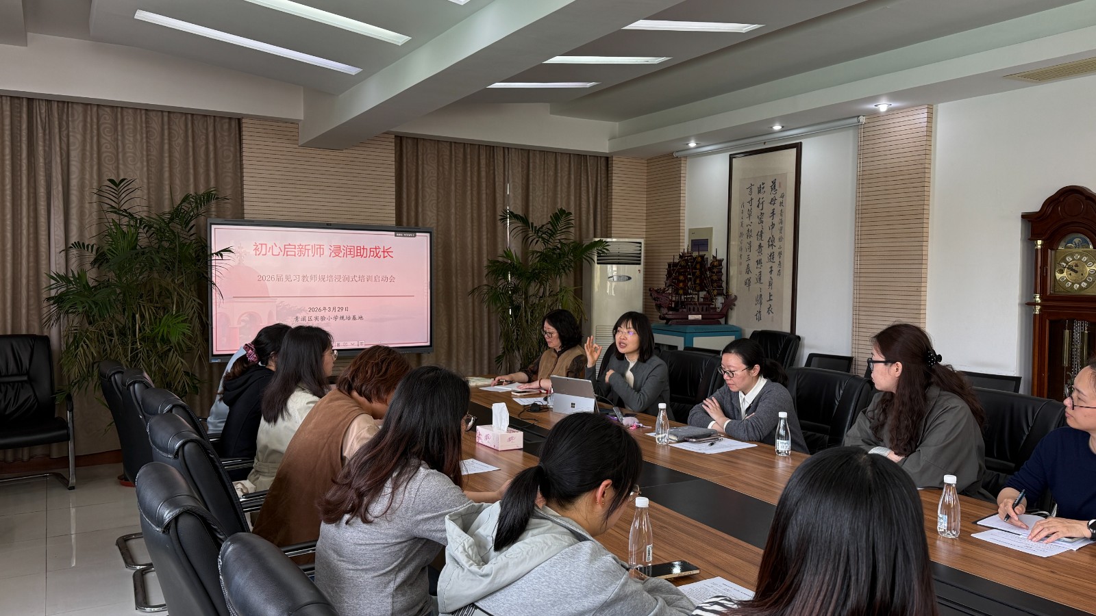 4月10日下午,青浦区实验小学2026届见习教师规范化培训浸润式跟岗启动仪式顺利举行。校长徐峰、副校长余章、来自六所不同学校的新教师以及带教导师团齐聚实验小学会议室,共同开启为期45天的沉浸式跟岗培训。