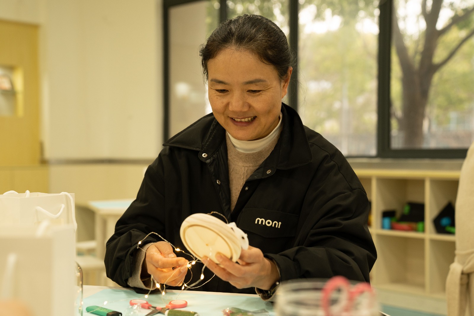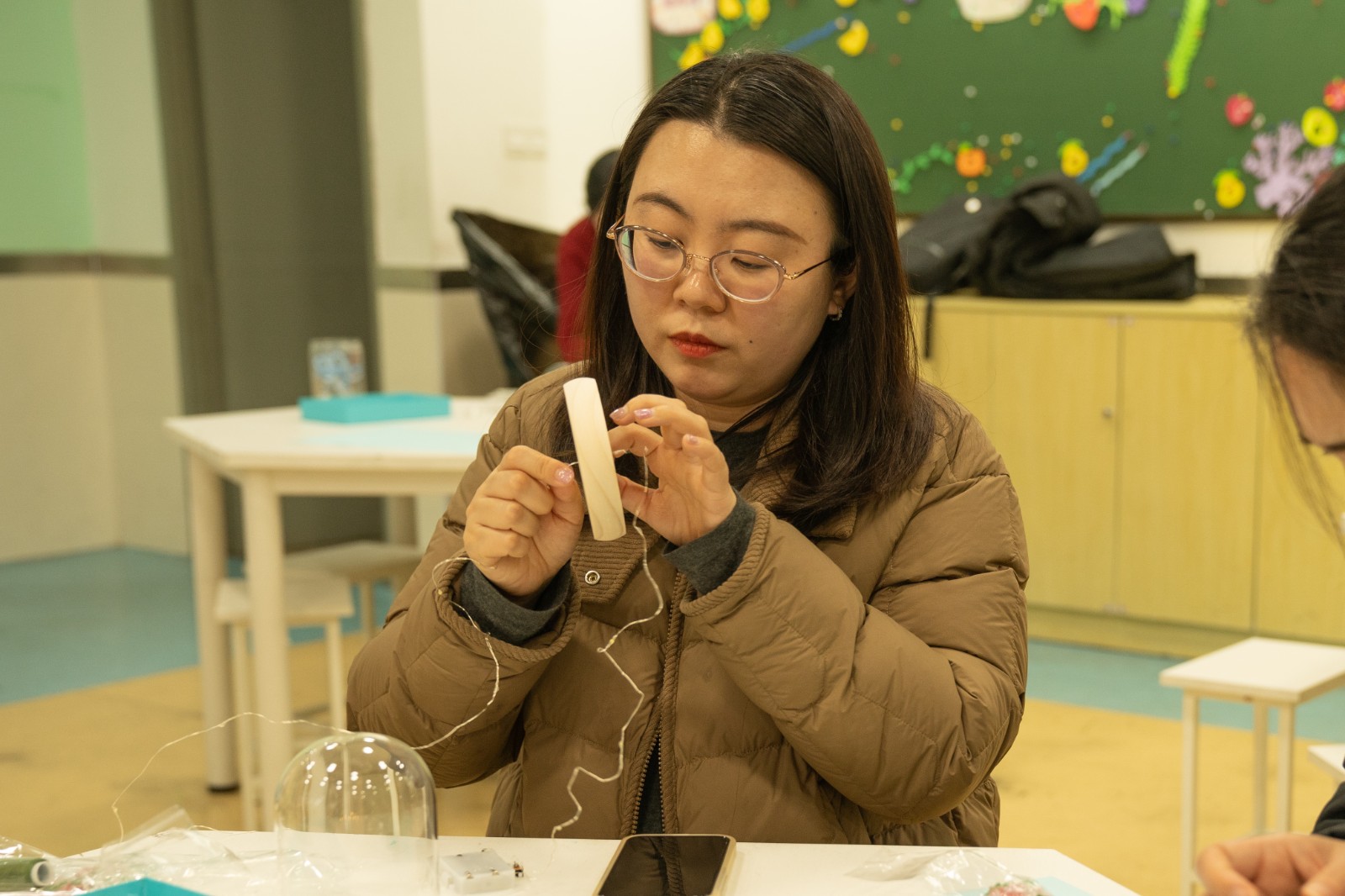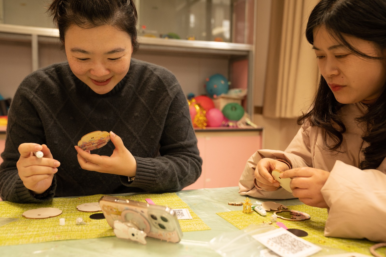 本次活动以“中式美学+动手乐趣”为核心,特设中式发光冰箱贴DIY、积木盆景拼搭、荷花灯制作三项特色体验,女教师们可根据个人喜好自主选择参与。中式发光冰箱贴DIY区,老师们用古风木质材料细致拼贴、创意组合,搭配柔暖 LED 灯,将中式的传统韵味与冰箱贴巧妙融合,点亮后的冰箱贴古朴又灵动,为“女神”们装点生活。
