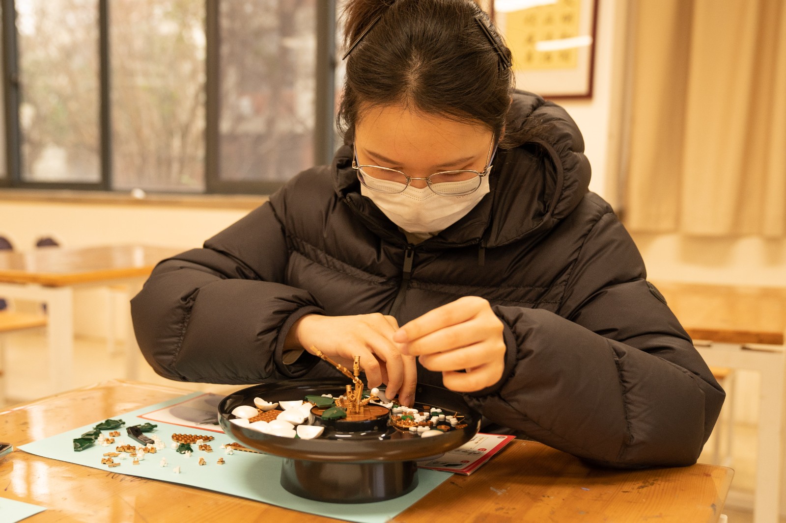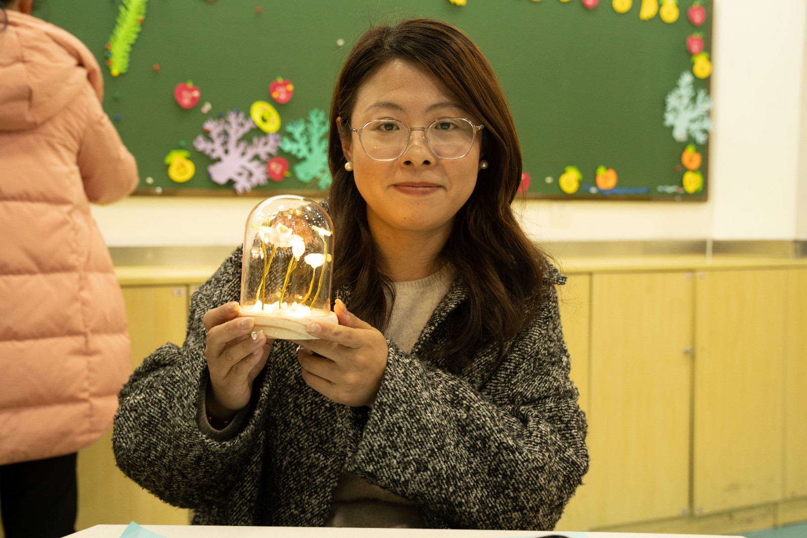 积木盆景拼搭区,大家静心拆解、拼接,用翠绿积木模拟枝叶,以仿真花朵点缀其间,一个个永不褪色的迷你盆景在指尖绽放,寄托着“女神”们对生活的热爱与雅致追求。荷花灯制作区,老师们耐心穿线糊纸,一盏温润雅致的荷花灯在老师们的指间逐渐成型,灯光亮起时,暖光氤氲,满室浪漫,尽显“女神”们的温柔巧思。