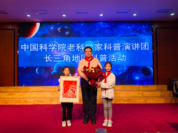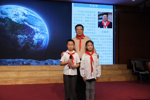 三年级少先队员代表为中科院国家天文台王俊杰研究员佩戴上鲜艳的红领巾,欢迎科学家的到来。