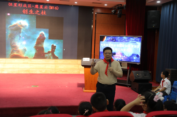 讲座中,王教授从孩子们最熟悉的太阳系讲起,通过精美的银河系模型,带领同学们"飞越"浩瀚星空。当展示著名的"创生之柱"图片时,同学们发出阵阵惊叹——原来恒星就诞生在这些瑰丽的星云之中!