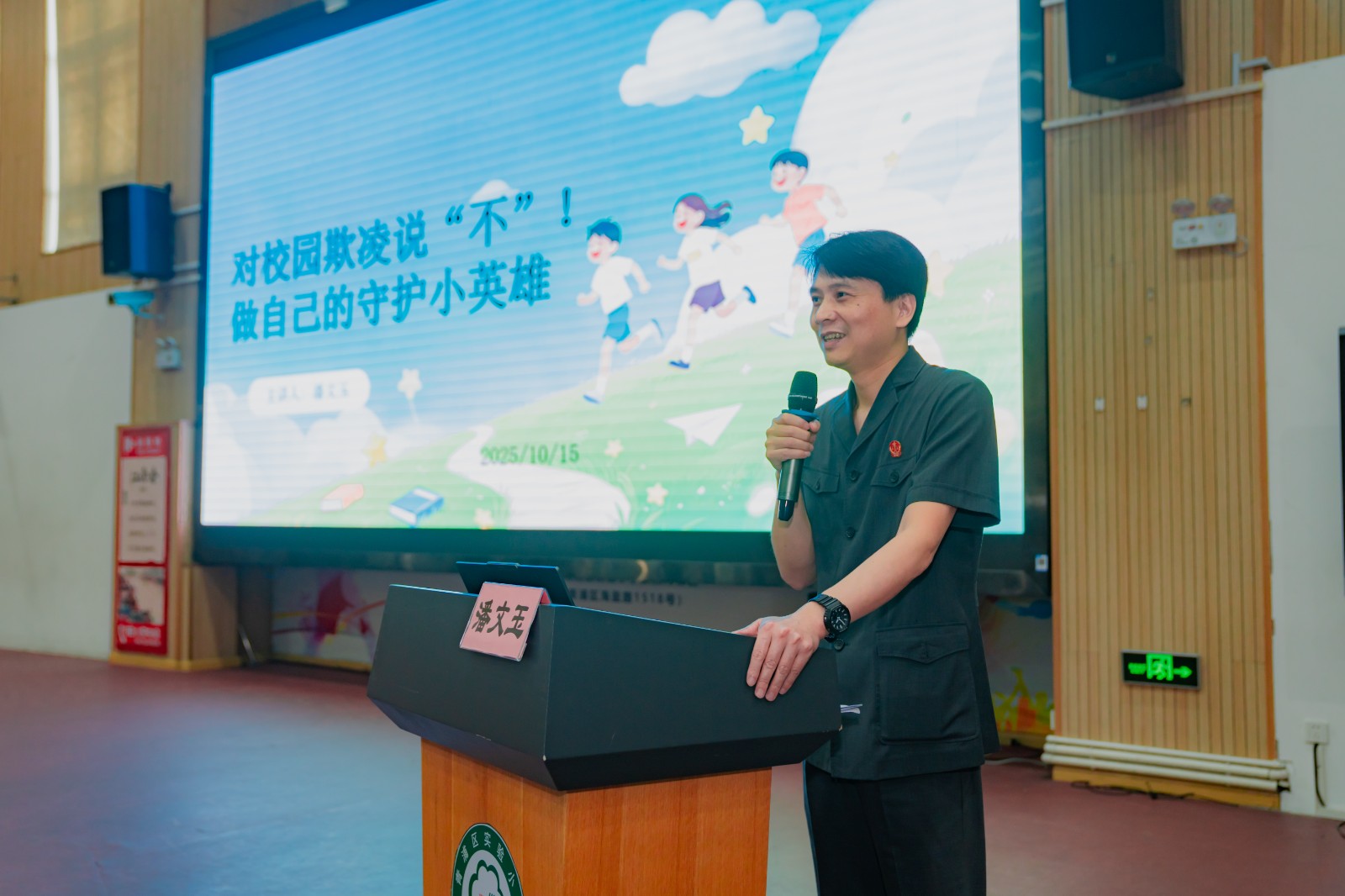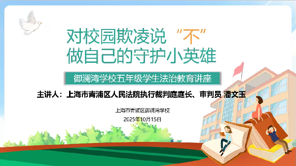为提升学生对校园欺凌的认知,增强自我保护意识,营造安全、友善的校园环境,我校于10月15日下午,特邀学校法治副校长、上海市青浦区人民法院执行裁判庭庭长、审判员潘文玉为全体五年级学生带来了一场主题为“对校园欺凌说‘不’,做自己的守护小英雄”的法治专题教育讲座。
