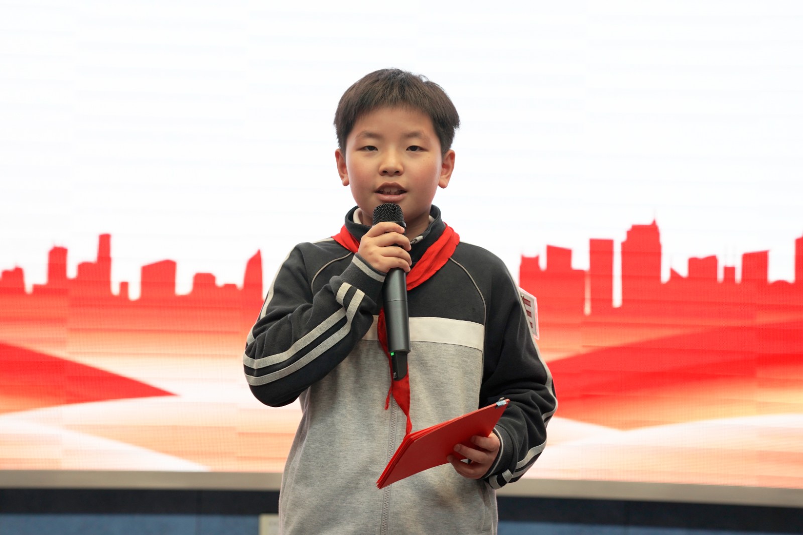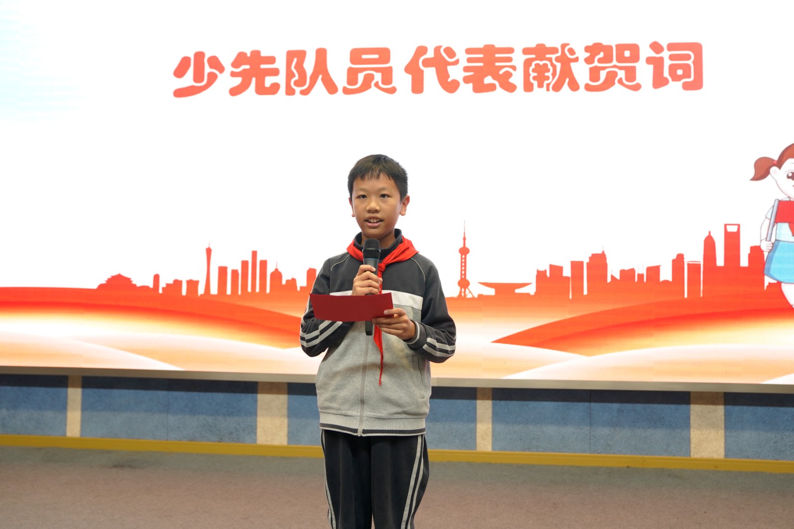 少先队员代表张轩睿登台献贺词,用真挚的语言表达了对少先队组织的热爱与对未来的憧憬;团总支书记郑毓灵老师发表贺词,寄语全体少先队员牢记使命、奋勇争先,在成长路上勇担时代责任。