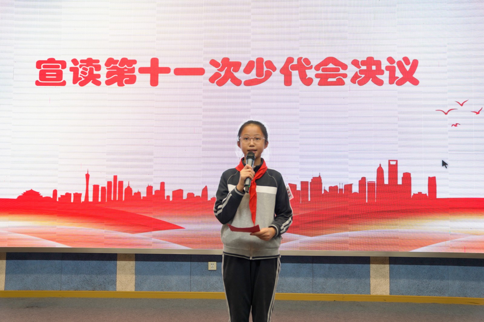 10月31日,少代会正式会议隆重举行。学校党政领导、团总支书记、家委会各部门负责人与110名少先队员代表齐聚一堂,共赴这场属于少先队员的盛会。会议由五(4)中队罗靖萱与三(5)中队卢彦杰主持。