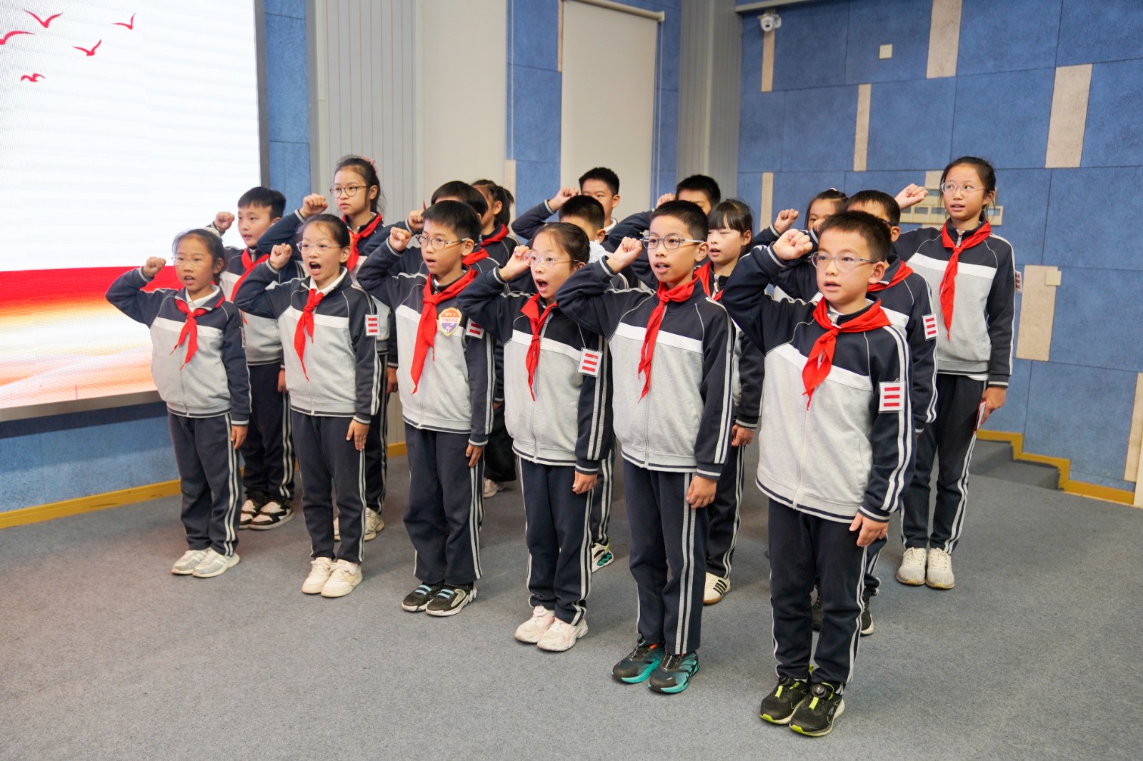 在全体代表的见证下,校长顾文荣、副校长刘萍、家委会副主任梁茜茜与服务保障部朱琰莉为新一届大队委员授予队标志,佩戴徽章的瞬间,责任与使命悄然传递。大队辅导员薛思豪带领新当选的大队委员面向队旗庄严宣誓,铿锵有力的誓言表达了他们服务同学、奉献校园的坚定决心。