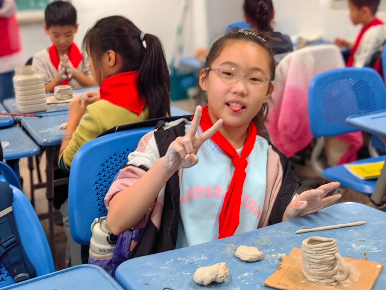 户外研学活动结束后,队员们重返课堂,亲身体验泥塑陶杯的制作过程。首先由专业老师向大家讲解并演示陶杯的制作方法。随后,学生们纷纷化身“小小陶匠”,在老师的指导下用陶泥亲手制作属于自己的陶杯。揉泥、塑形、装饰……每一道工序都凝聚着孩子们的专注与智慧。一块块朴素的陶泥,在一双双巧手下逐渐变成了一个个独具特色、充满童趣的陶杯坯体。