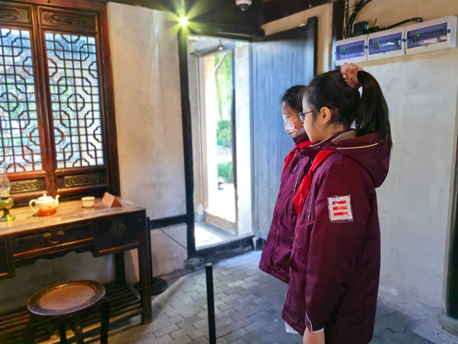 从纪念馆走出,队员们步入毗邻的陈云故居。一座朴素的江南民居,保留着当年的生活原貌。这里的一砖一瓦、一桌一椅,都静静诉说着陈云同志早年的生活轨迹。厨房里的灶台、书房里的小桌,仿佛让队员们看到了少年陈云在此勤学苦读、立志报国的身影。从这方小小的天地走向广阔的革命舞台,他始终保持着劳动人民的本色和对故乡的深情厚谊。席老师为队员们讲述了陈云同志从小严于律己、勤奋好学的故事,在他成长起步的地方,队员们感悟到伟大品格源于日常的积淀。