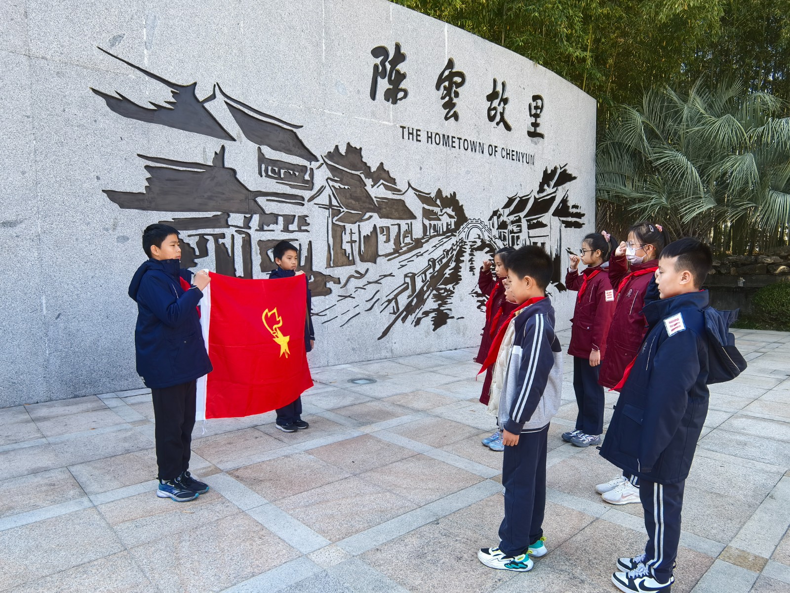 活动的最后一站,队员们来到庄重的陈云故里碑前。在席时怡老师的带领下,8位少先队员整齐列队,面向鲜艳的队旗,高举右拳,重温入队誓词。“我是中国少年先锋队队员。我在队旗下宣誓:我热爱中国共产党,热爱祖国,热爱人民,好好学习,好好锻炼,准备着:为共产主义事业贡献力量!”