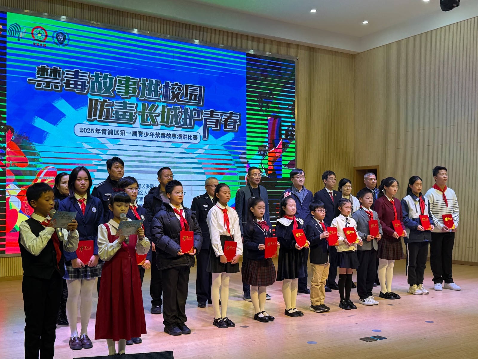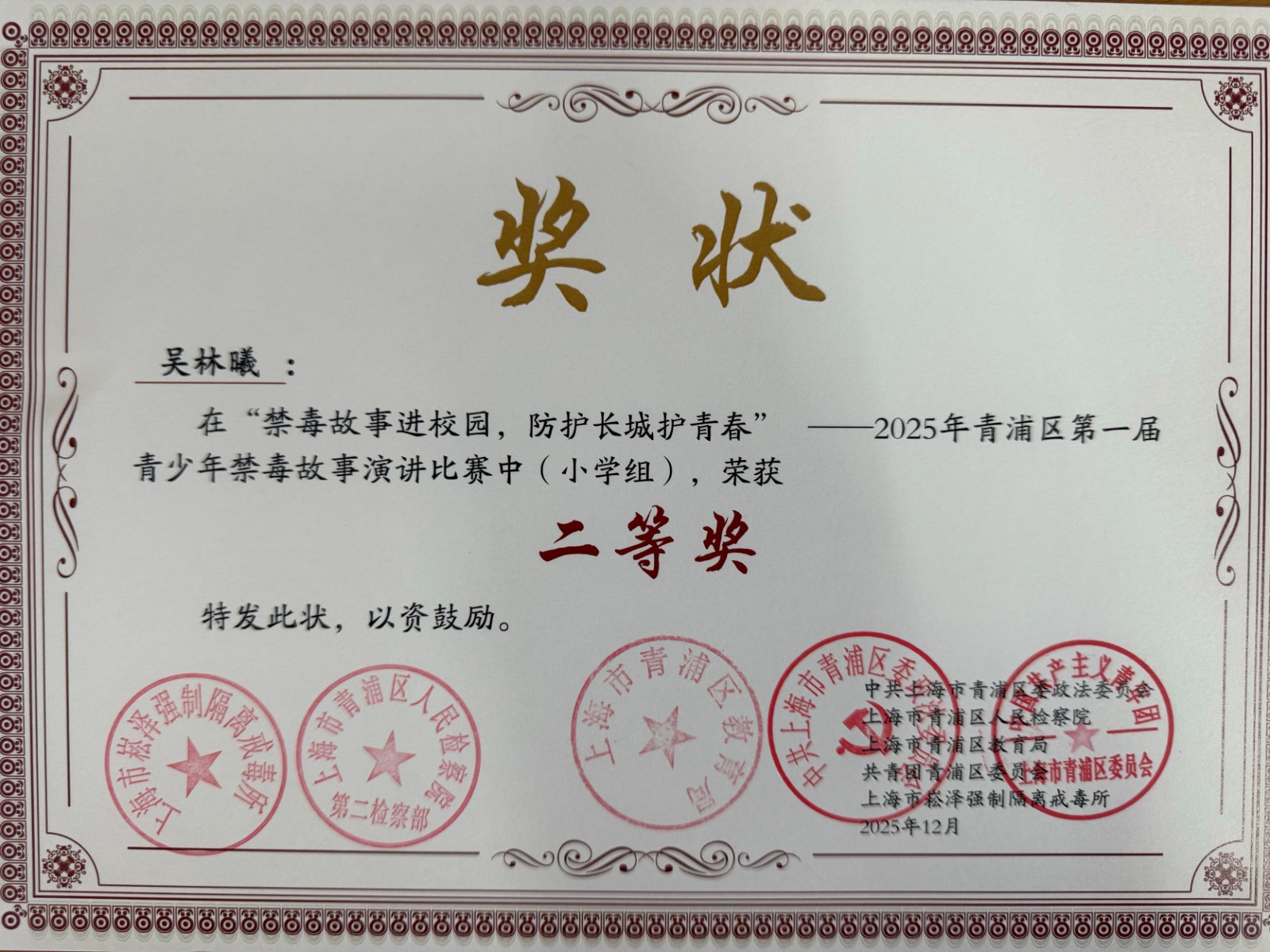 在禁毒故事讲演活动中,四、五年级学生积极参与,从撰写演讲稿到制作演示课件,再到班级初赛与视频录制选拔,全过程认真投入。学生们不仅深入学习毒品的危害知识,更在语言表达、舞台表现与心理素质方面得到显著锻炼。经过层层遴选,我校代表队在区级比赛中脱颖而出:四 = 3 \* GB2 \* MERGEFORMAT ⑶中队吴林曦同学荣获二等奖;三年级李优、裘静恩两位首次参赛的同学也凭借出色表现斩获优秀奖,展现了实小学子良好的精神风貌与综合素养。