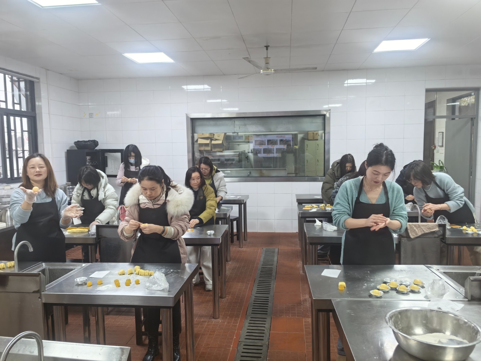 会议结束后,一场兼具烟火气与仪式感的点心制作体验随即开启。在专业点心教师的手把手指导下,老师们兴致盎然地投入实践,沉浸式解锁中式凤梨酥与西式肉松小贝、巴斯克蛋糕的制作技巧。揉制凤梨酥内馅时的细致配比,塑形肉松小贝时的巧思搭配,烘烤巴斯克蛋糕时的满心期待,指尖流转间,香甜气息渐渐弥漫全场。一个个造型精致、风味独特的点心新鲜出炉,现场欢声笑语交织,既舒缓了一学期的工作疲惫,又在协作互动中拉近了同事情谊,为本次期末班主任相聚画上了甜润而圆满的句号。