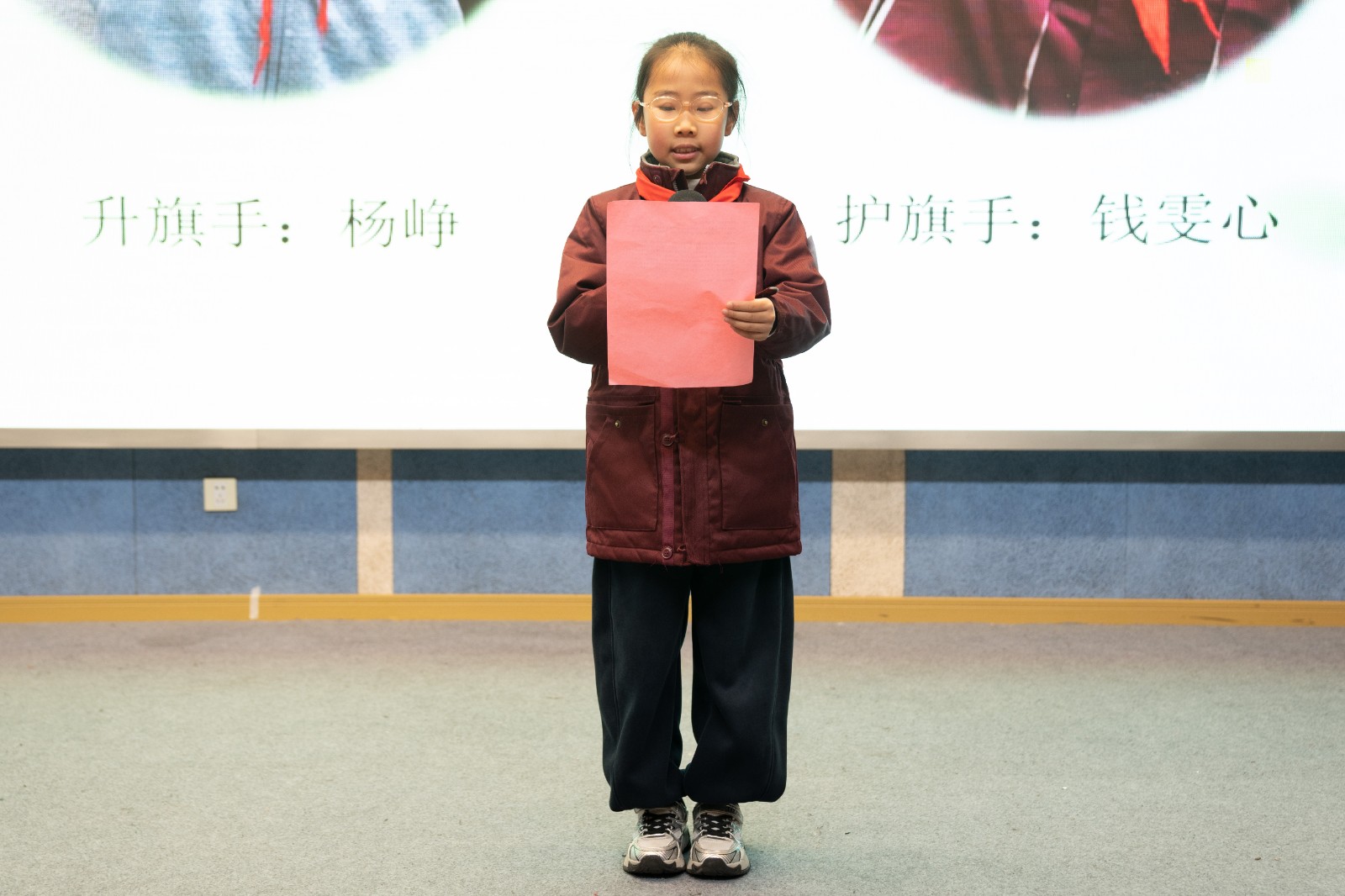 典礼伊始,三(8)中队孙语琪同学介绍了本周升旗手、护旗手的先进事迹,并发表主题讲话。她以少年的赤诚,满怀憧憬地寄语全体同学,愿大家不负春日好时光,不负青春好韶华,在校园这片沃土上,播种希望、奋力生长,以昂扬姿态奔赴新学期的每一场精彩。