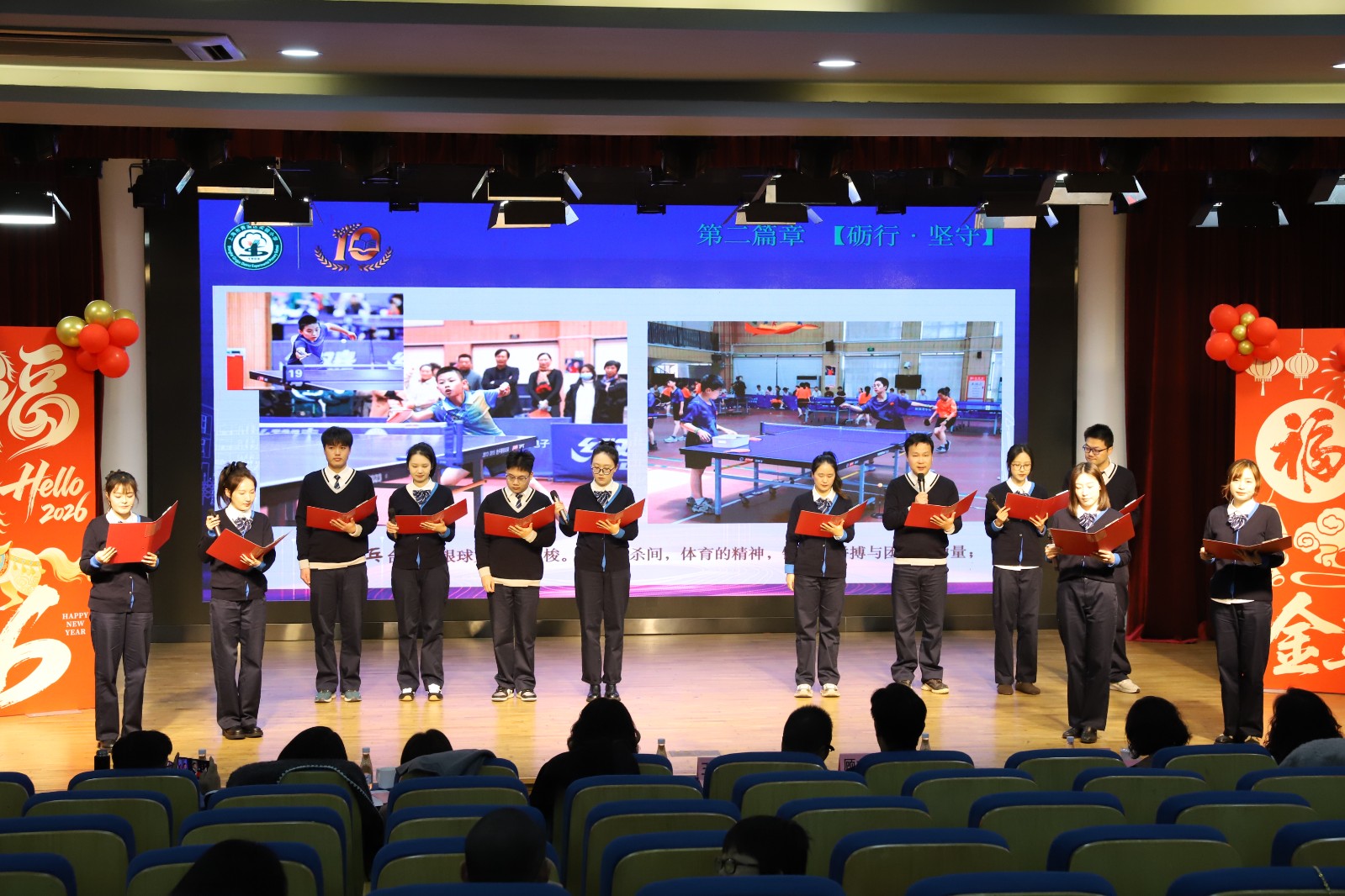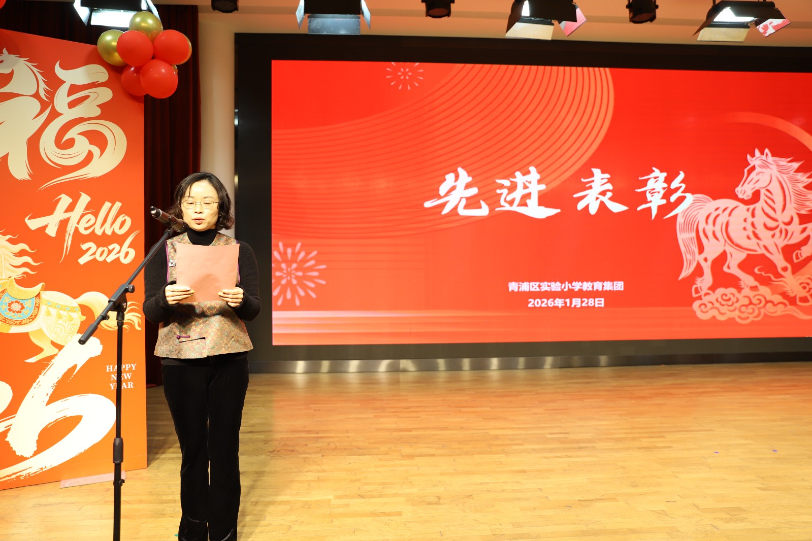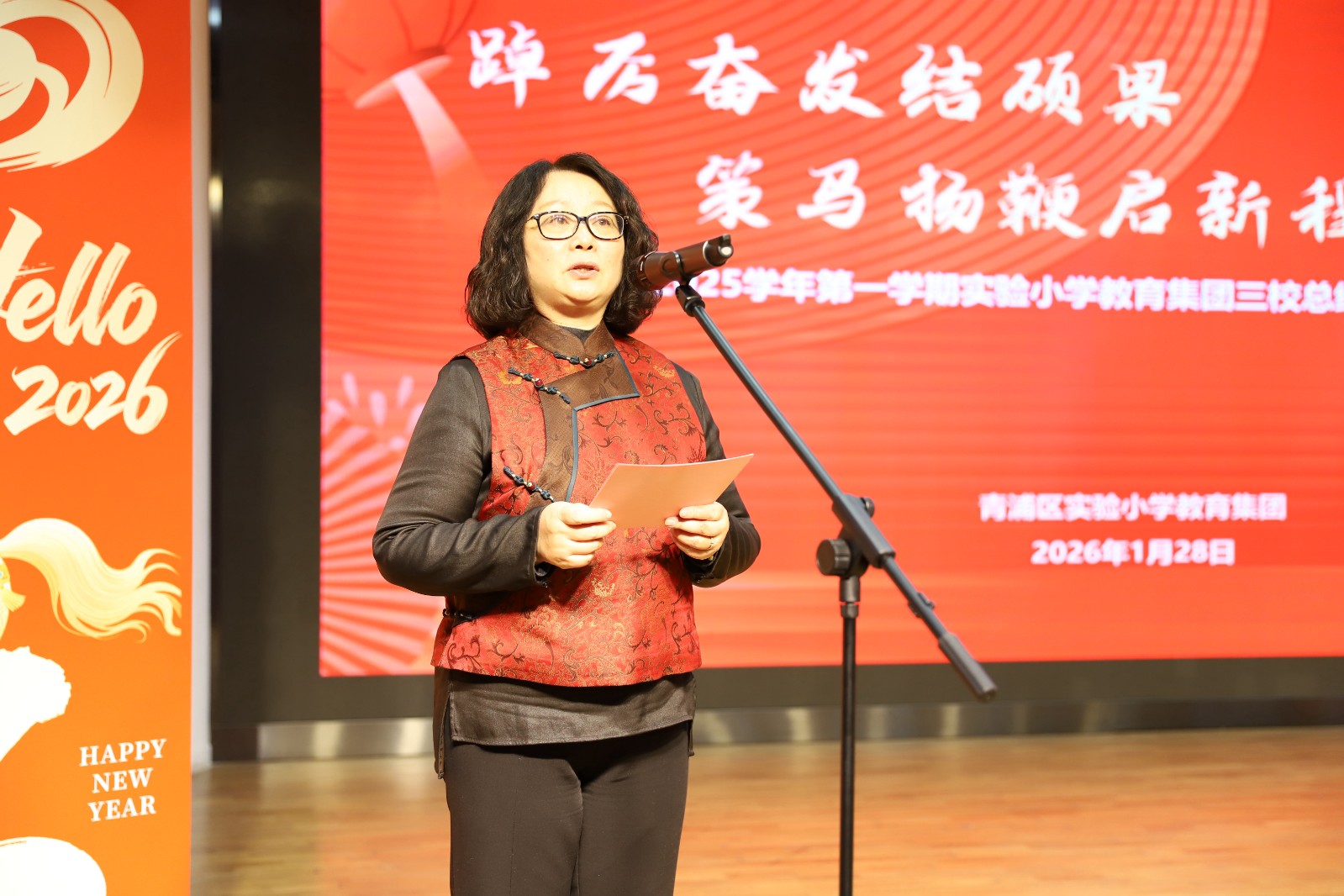 新元肇启,华章日新。为总结过往耕耘成果,表彰先进树立榜样,规划未来发展蓝图,共迎2026甲辰新春,实验小学教育集团三校齐聚豫英小学多功能厅,隆重举行2025学年第一学期总结表彰大会暨2026年迎新活动,全体教职工共赴这场满载收获与希望的盛会。活动由御澜湾学校副书记沈红丽、豫英小学副书记蒋丰呈主持。
