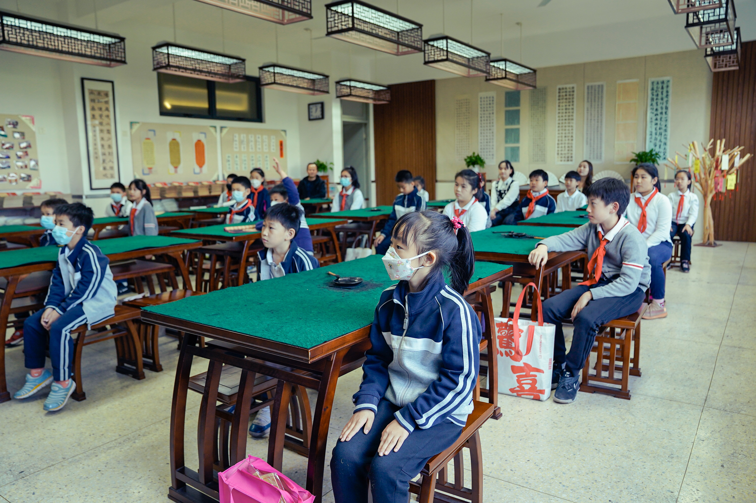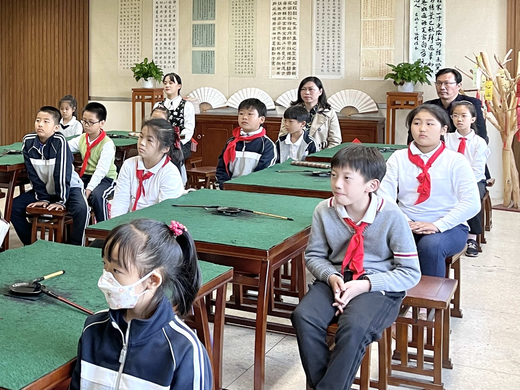 随后,陈鹏老师来到学校传统书法教室仁义斋,孩子们早已正襟端坐、翘首以盼专家老师的到来。学校顾文荣校长、刘萍副校长,以及书法专职教师们也全程参与,与孩子们一同聆听书法艺术的魅力。