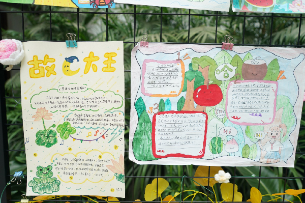同学们担任“夏日故事大王”,围绕雷雨、荷花、蝉鸣等夏季元素,创编出精彩的童话故事,并运用绘画、剪贴等方式将故事生动呈现。这项作业不仅激发了学生的想象力,更让他们在图文结合的创作中,收获了表达与创造的快乐。