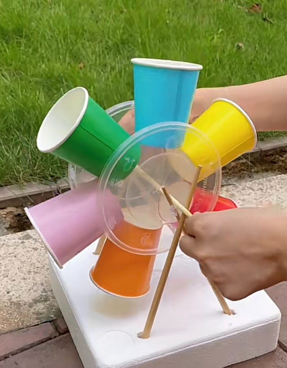 解锁任务:塑料瓶盖、雪糕棒就能做水轮!装上支架和叶轮,倒点水就能转起来,相信你也一定能做到!记得写份“水轮说明书”,说说你的水轮最特别的地方哦!