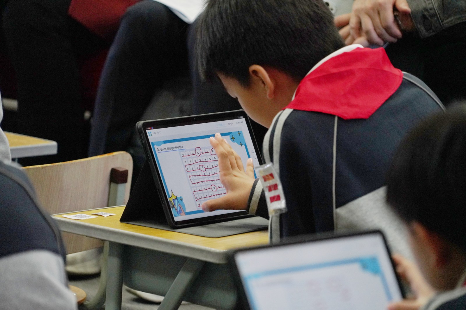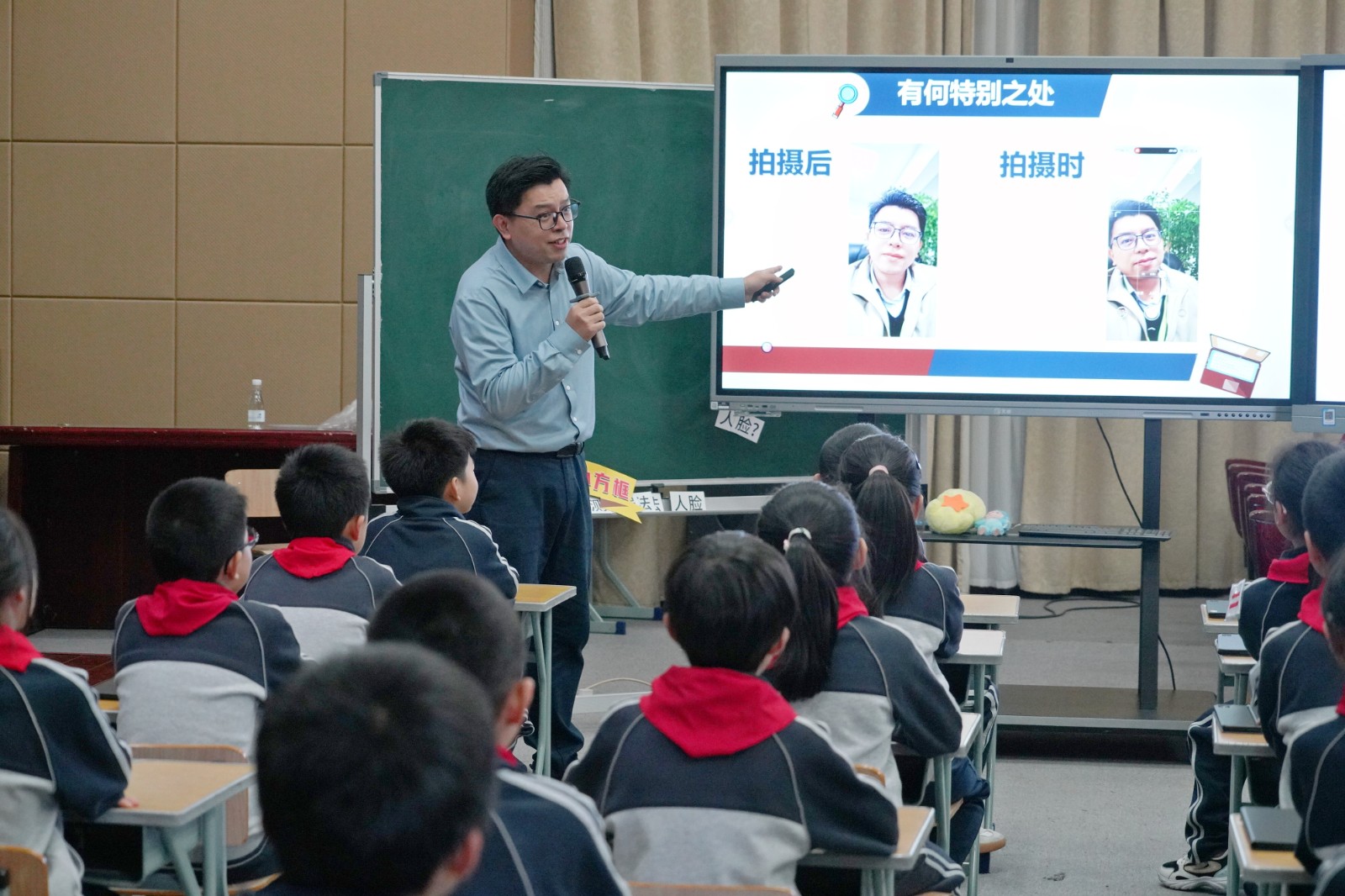 活动伊始,豫英小学张杨旭老师执教了《相机中的小方块》一课。作为第二单元“图像识别”的核心课时,课程承接图像分类知识基础,以贴近学生生活的相机拍照、美颜等场景为切入点,通过“明确检测对象”“探索检测关键”“体验检测方法”三个层层递进的实操活动,引导学生理解人脸检测“定位面部区域、标记关键特征”的核心目标。课堂上,张老师借助平板“三个助手”、AI分析等数字工具,将抽象的“滑窗法”通过“找‘目’字”类比操作具象化,有效突破教学难点,同时注重引导学生遵循技术使用规范,落实认知、技能、思维与价值观的多元培养目标。