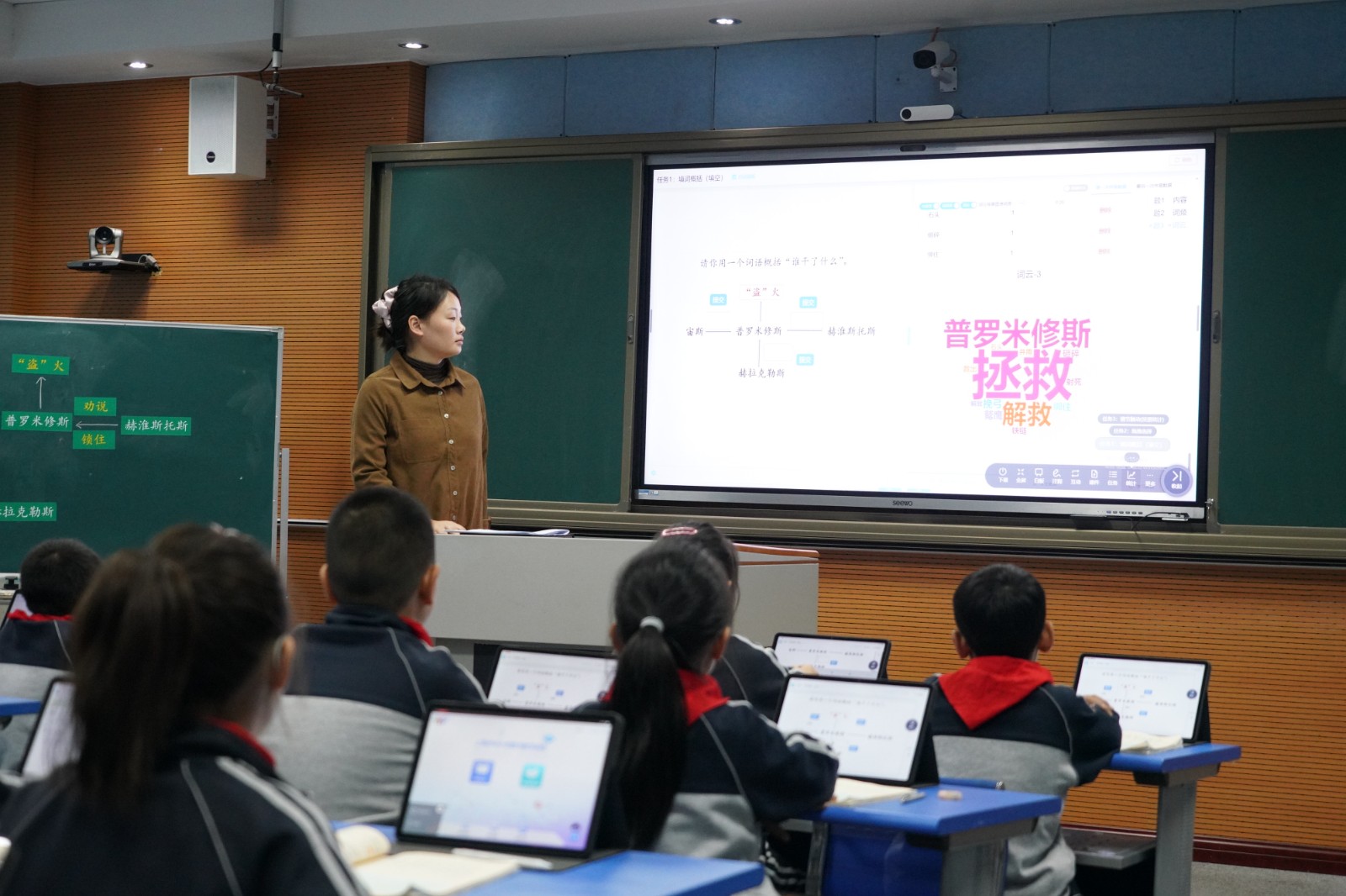 活动伊始,豫英小学诸馨怡老师执教四年级上册《普罗米修斯》第一课时,紧扣单元语文要素,以“梳理人物事件—归纳故事情节—分析人物形象—展开想象复述”为任务链,为学生搭建了清晰的认知框架,展现了结构化教学设计的巧思。课堂上,诸老师充分依托数字化教学平台,将传统神话教学与现代技术深度融合,例如在概括人物事件环节,借助“词云”直观呈现全班观点,有效激发思维碰撞。数智技术的介入,不仅让学习过程变得可视、可感,更实现了学情的即时反馈与教学的精准调控。