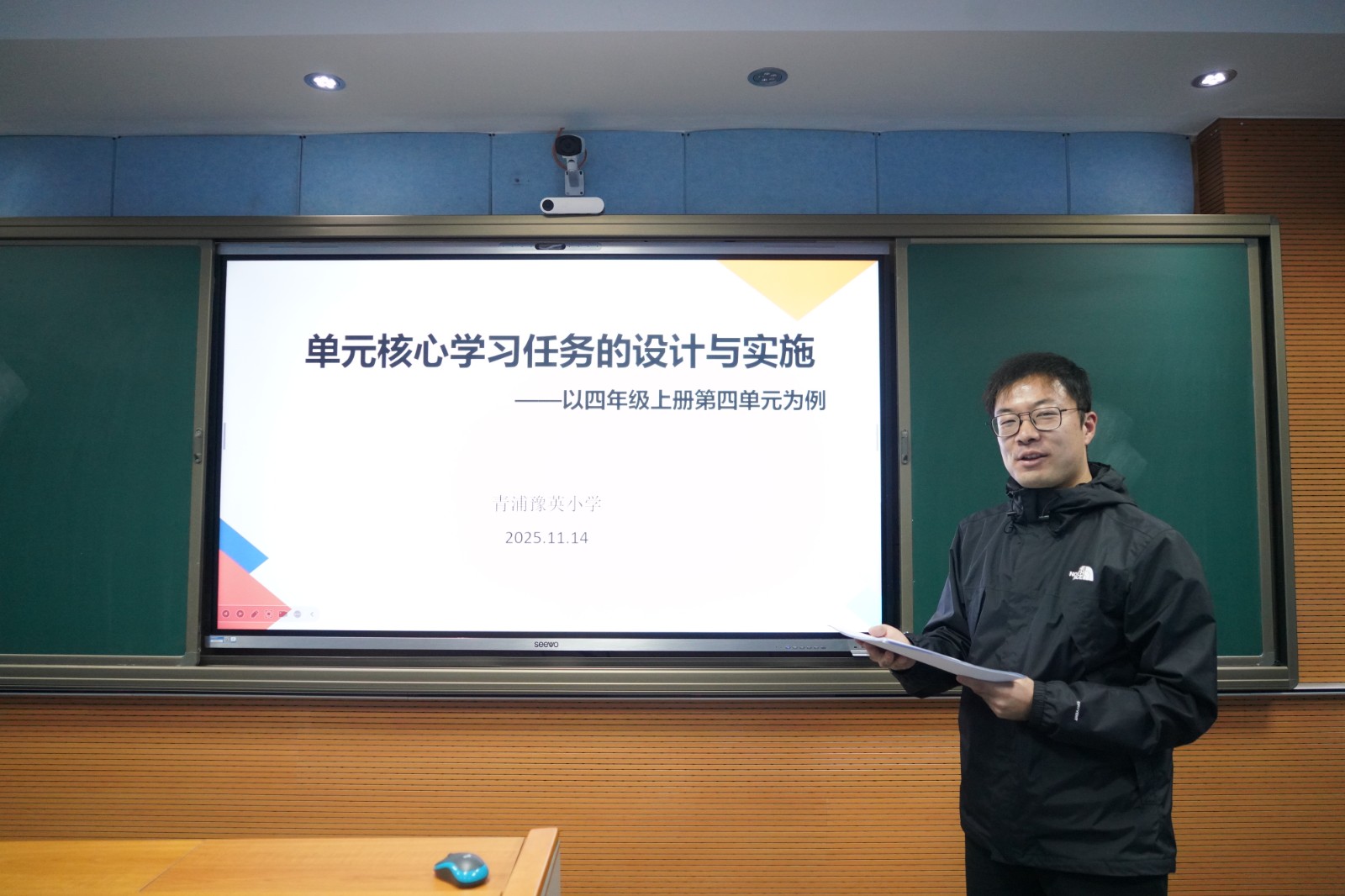 在主题交流环节,豫英小学四年级组的两位老师分别从单元整体和数字转型角度分享了他们对于教学的深度思考。吴一辰老师系统阐释了“四年级上册第四单元设计与实施”的整体思路,展现了备课组对教材的体系化把握。吴一尘老师则聚焦“数字化转型下神话教学新路径”,分享了利用备课助手设计学件的经验与技巧,结合实例阐述了如何利用技术工具拓展学习边界,为探索“学·用·创”一体化教学提供了理论支撑与实践参考。
