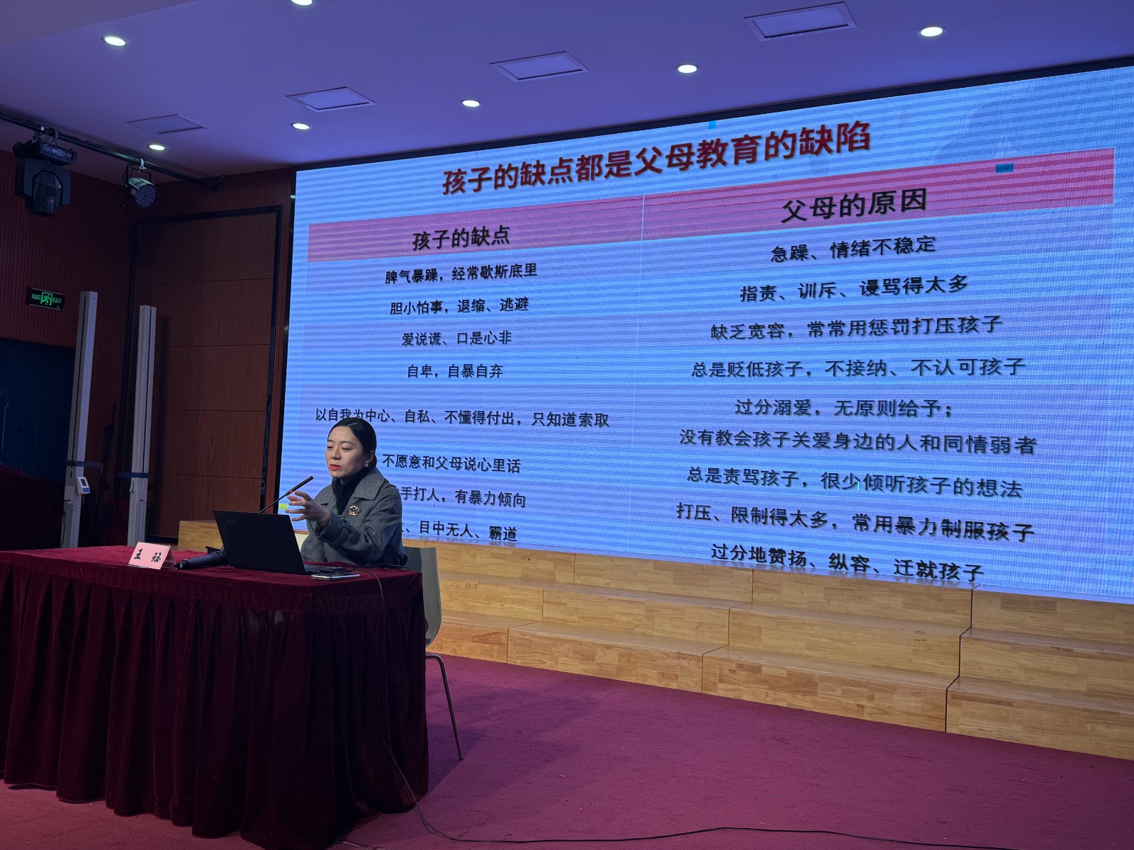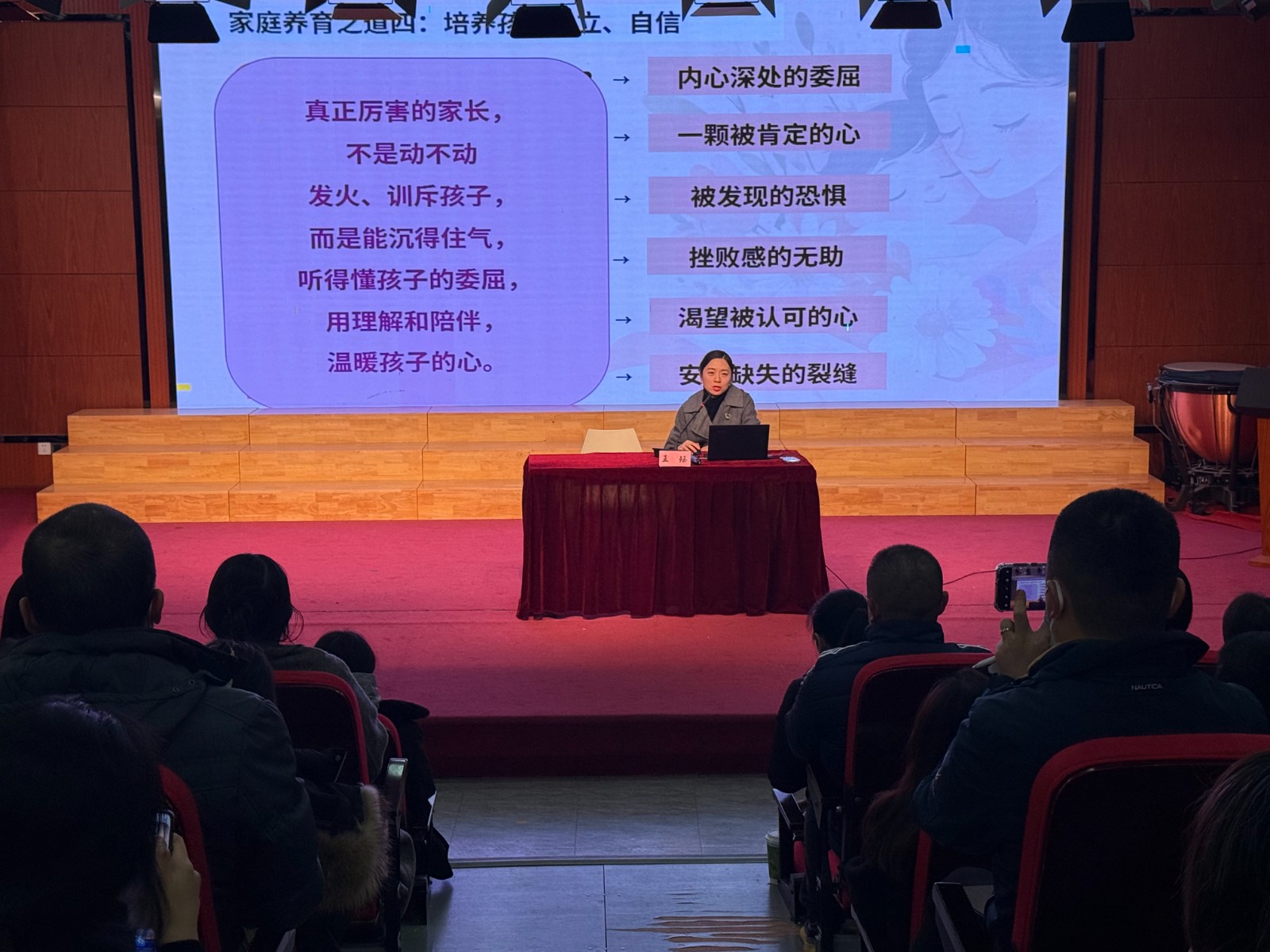 王珏老师从一个家庭教育公益广告入手,让家长们很快进入了“家庭教育可以影响孩子”的意识状态。随后,她以调查数据结合教育案例的形式,把家庭教育的理论结合实践,向家长们娓娓道来。她把好的教育目标,概括为要培养“终身运动者,责任担当者,问题解决者,优雅生活者”,要求家长调节好情绪,和孩子保持沟通,做好情绪管理,建立底线,试着不要惩罚孩子,同时站在孩子的角度去理解,孩子为什么发脾气,为什么跟你斗嘴,为什么说谎,为什么拖拉磨蹭,为什么拼命讨好,为什么冷漠不语……呼吁家长做真正厉害的家长,听懂孩子的委屈,用理解和陪伴,温暖孩子,培养孩子的自立,自信。