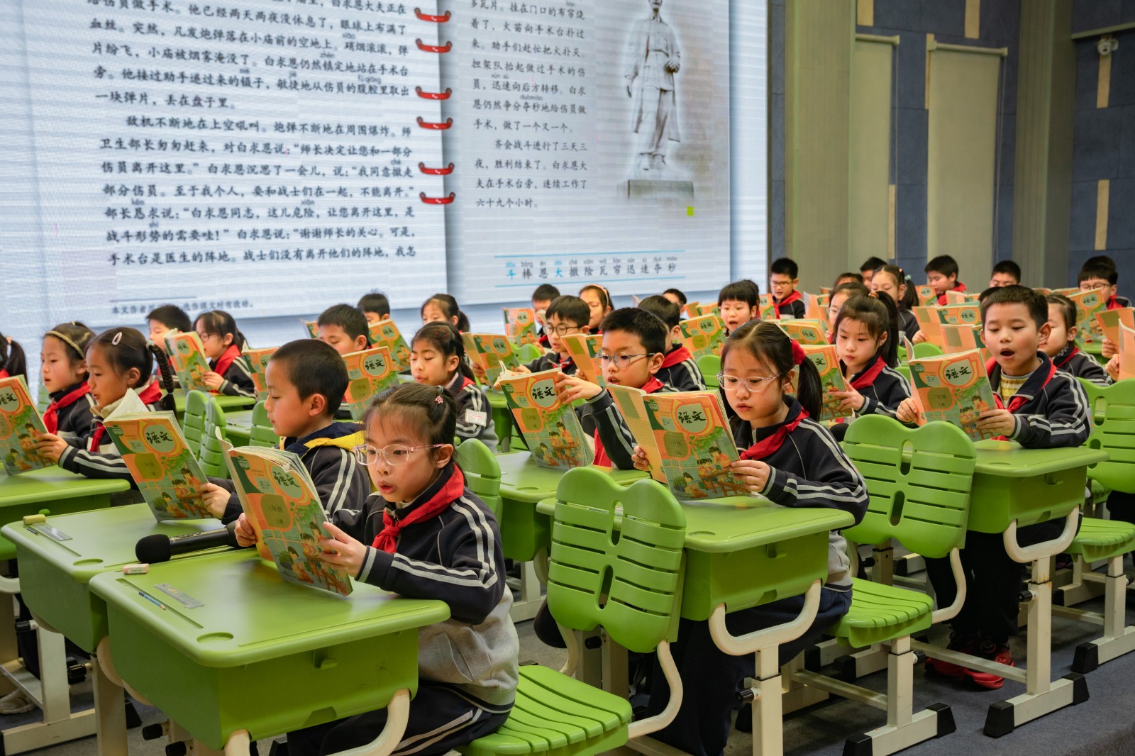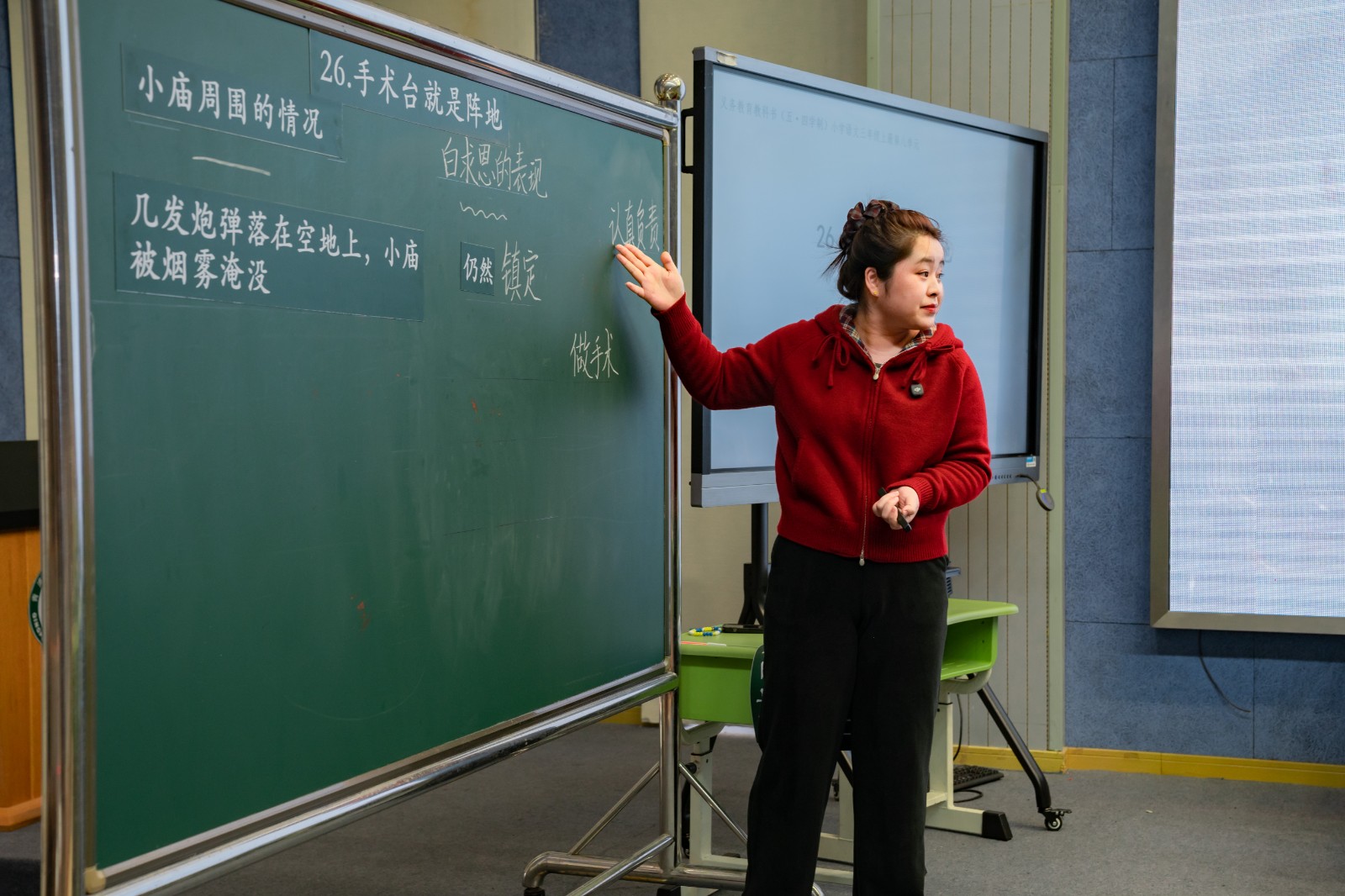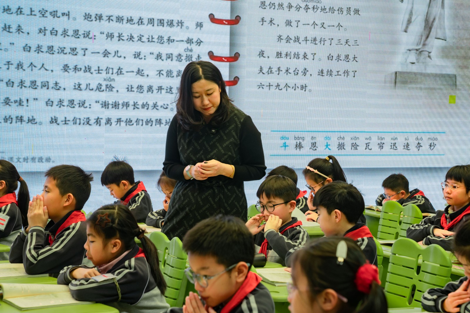 首先,御澜湾学校盛思远、潘敏月两位教师分别执教了三年级上册第八单元课文《手术台就是阵地》的两个课时。两位教师紧扣教学目标,围绕单元核心学习任务开展教学,环节清晰且层层递进。教学中,先引导学生抓住时间、地点、人物、事件等要素,大致说清课文的主要内容;再通过边默读边圈画相关语句的方式,梳理小庙周围的战斗情况与白求恩大夫的表现,引导学生根据白求恩大夫的言行推断他的内心活动,体会他对工作极其负责的品质,以及崇高的国际主义、共产主义精神。通过本课学习,培养学生带着问题默读课文、边读边思的习惯,帮助他们掌握了解课文主要内容、体会人物品质的方法。