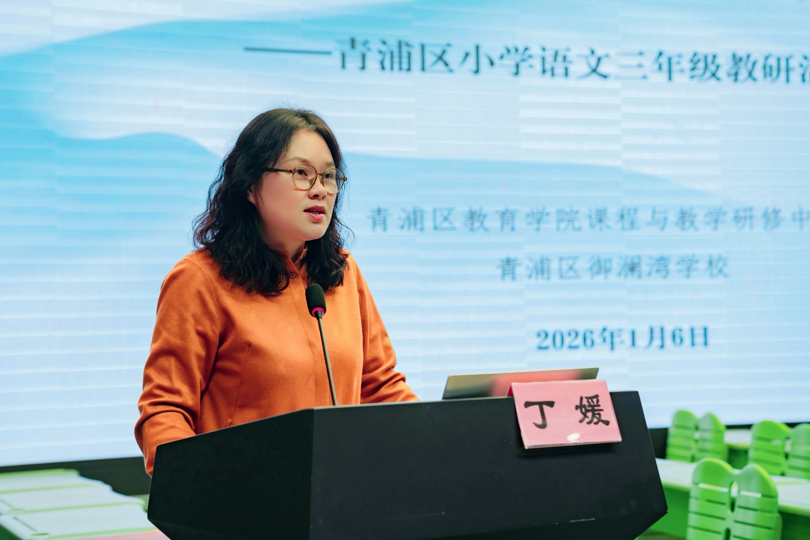 2026年1月6日下午,以“目标导向,保持教-学-评一致”为主题的青浦区小学语文三年级教研活动在御澜湾学校举行。青浦区教育学院小学语文教研员丁媛,御澜湾学校党支部书记、校长顾文荣,区各小学语文分管教导、三年级教研组长、骨干教师等共计120余人参加了本次活动。