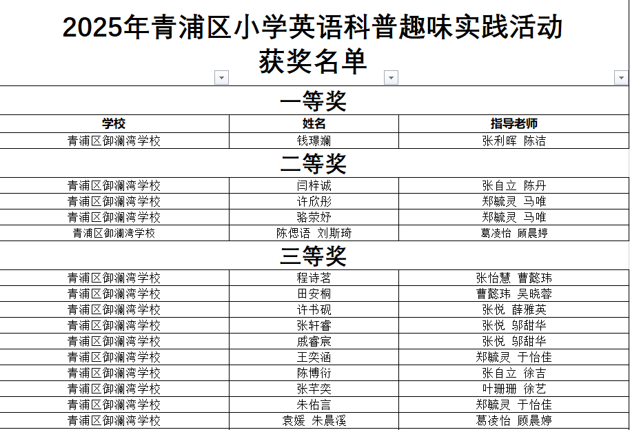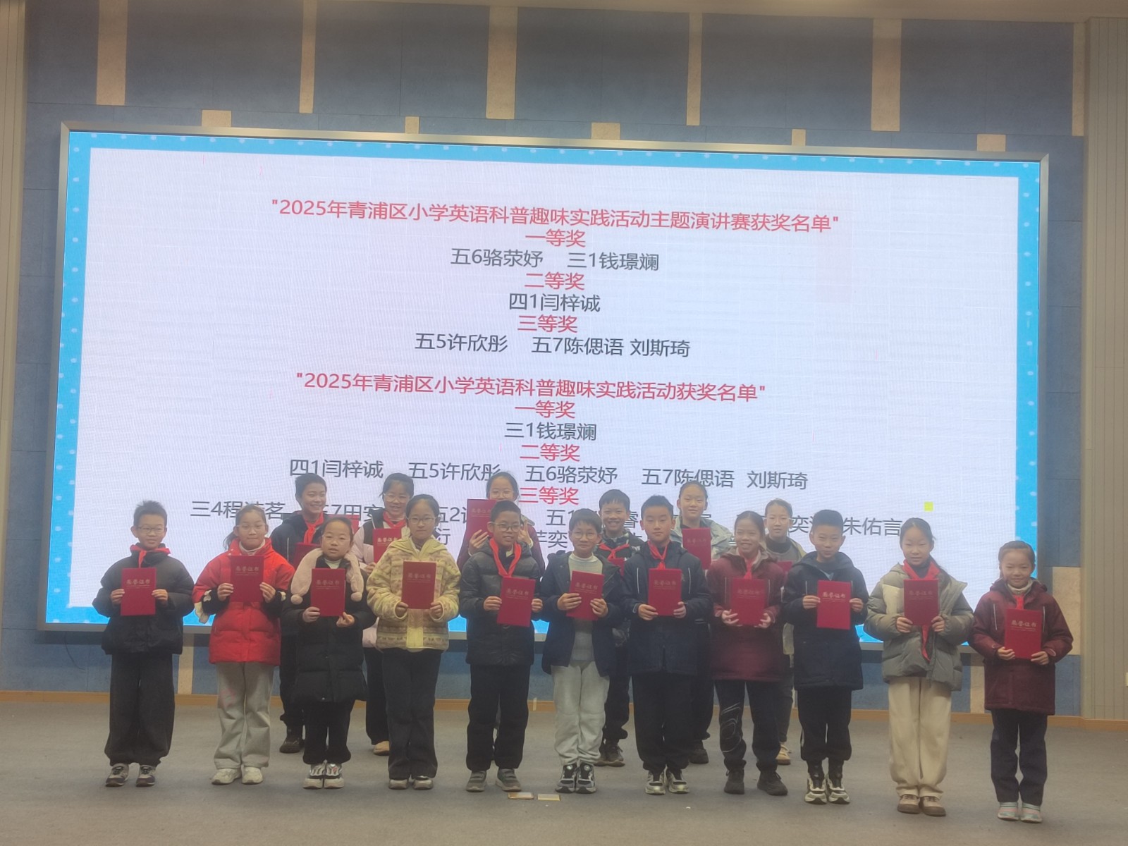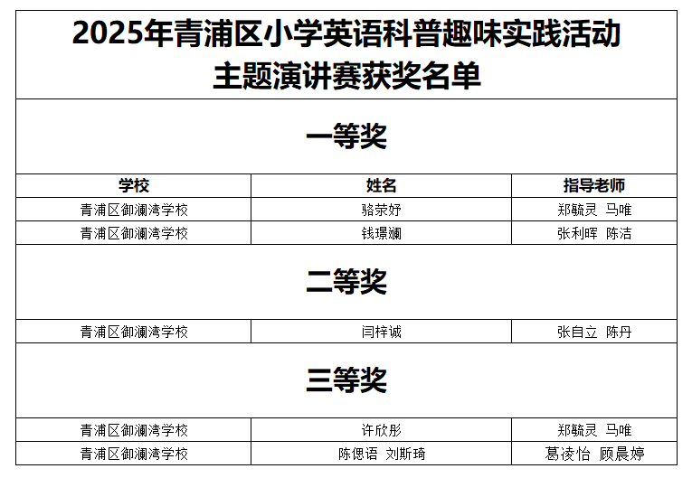 近日,青浦区青少年活动中心组织了“AI 小先锋”2025年青浦区小学英语科普趣味实践活动,旨在培养小学生的科学兴趣和创新思维品质,提升国际视野、团队合作和思辨能力,增强文化自信与国际理解。为了进一步鼓励学生通过自主学习和合作学习激发科学兴趣,用好奇的眼光深入探索人工智能那神奇而美妙的科学原理,提高创造性解决问题能力和公共演讲能力。我校英语教研组自开学之初便启动学生报名工作,并组织开展校级选拔,活动得到全校师生的踊跃响应与积极参与。赛事中,多名同学脱颖而出,分获区英语科普演讲比赛一、二、三等奖。