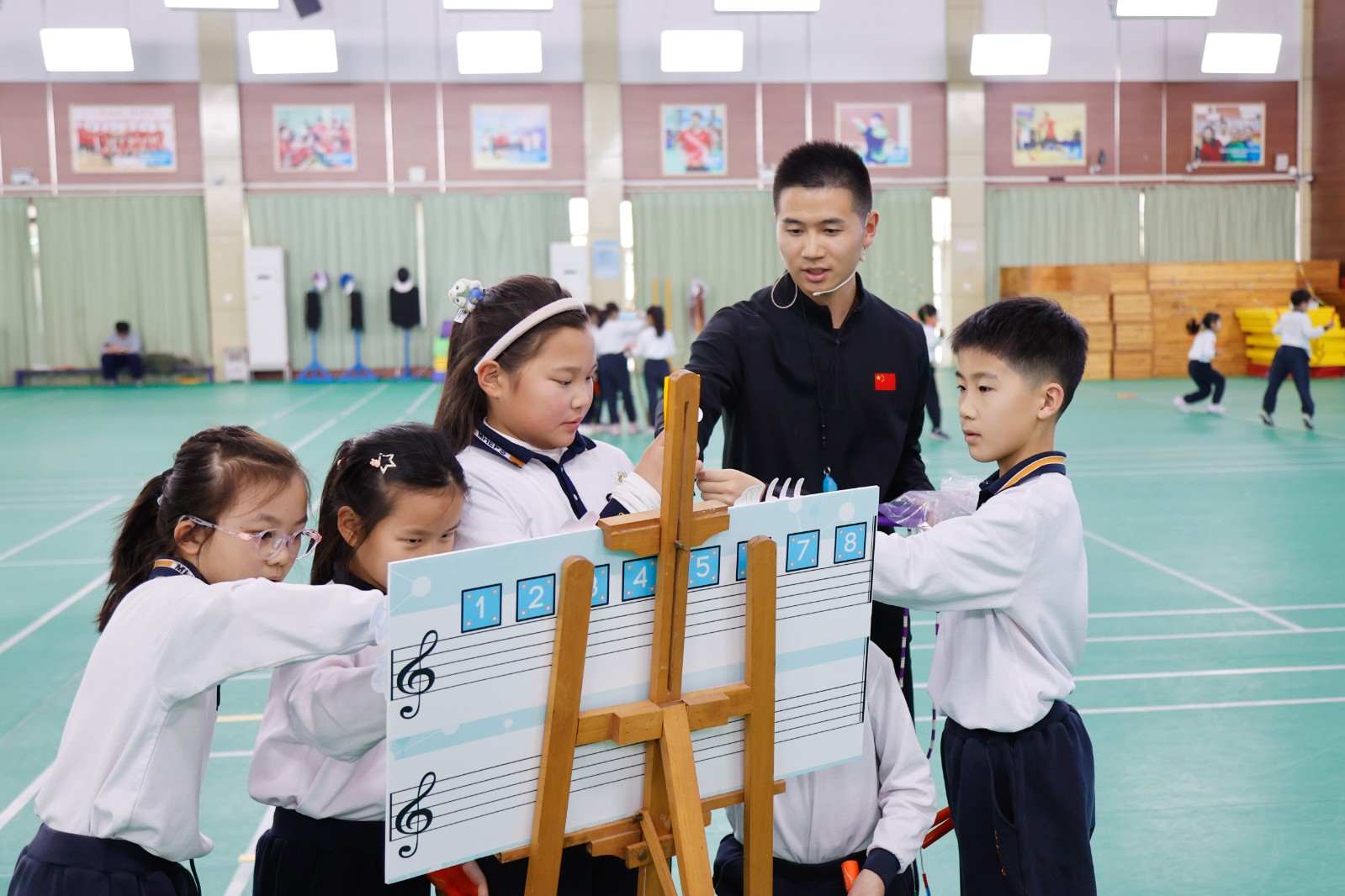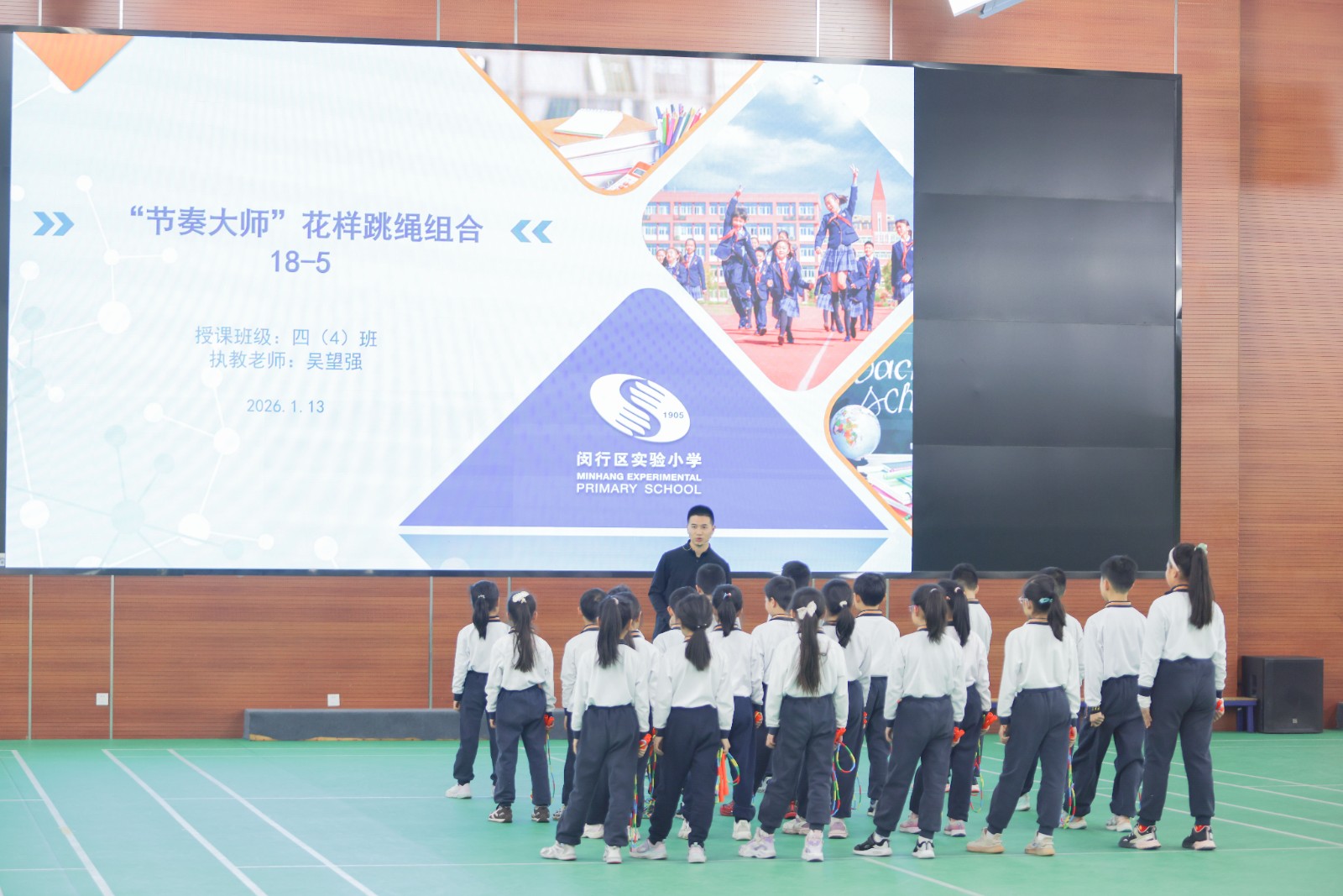 教学展示环节中,闵行区优秀青年教师研修班学员、闵行区实验小学吴望强老师带来了四年级《花样跳绳组合:节奏大师》课堂教学。整课创新打造“跳绳绳谱”,将音乐与跳绳动作深度融合,通过“初级-进级-大师”三级任务梯度,搭配“敲绳伴你跳”等趣味练习,辅以自评互评多元评价方式,让技能学习更具层次感。体能练习环节设计的疾风抢绳赛等活动,兼具专项特征与趣味性,充分调动了学习积极性。