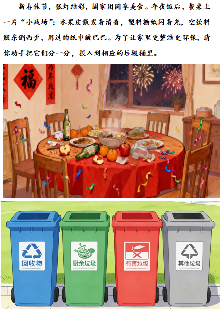 如二年级劳动“智慧小劳模”,以年夜饭后餐桌垃圾整理为场景,通过对垃圾进行分类,让学生学习垃圾分类知识,让家庭环境更干净。