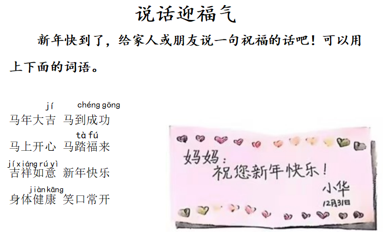 如一年级语文“交际小行家”,以新年为场景,通过拼一拼、说一说等任务,让学生熟练运用拼音并向家人、朋友传递新年美好祝愿。