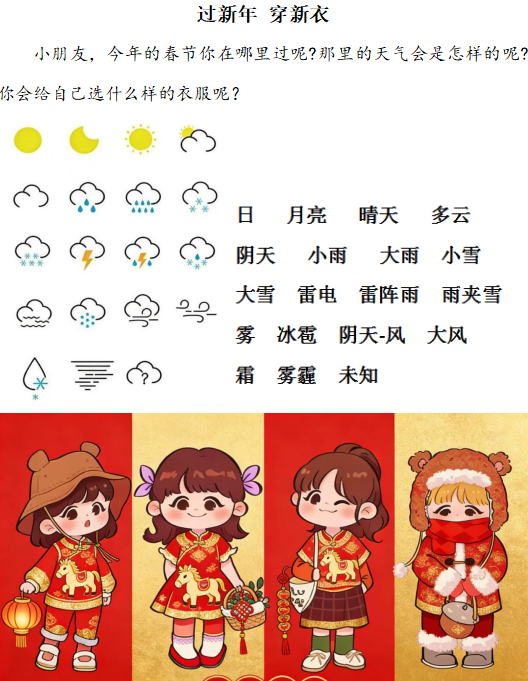 如一年级综合实践“生活小能手”,以过新年穿新衣为场景,让学生学会根据春节的天气为自己挑选合适的新衣。