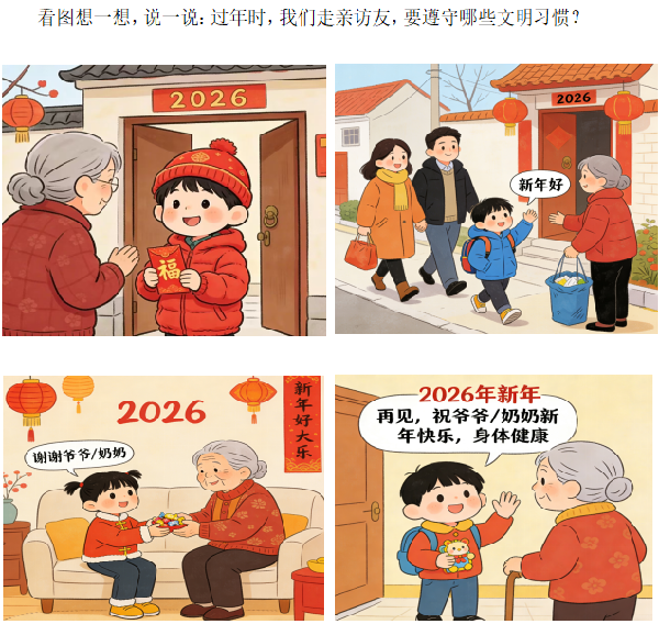 如二年级道德与法治“文明小使者”,以过年走亲访友为场景,通过看图想一想、说一说的任务,让学生学会文明交往礼仪。