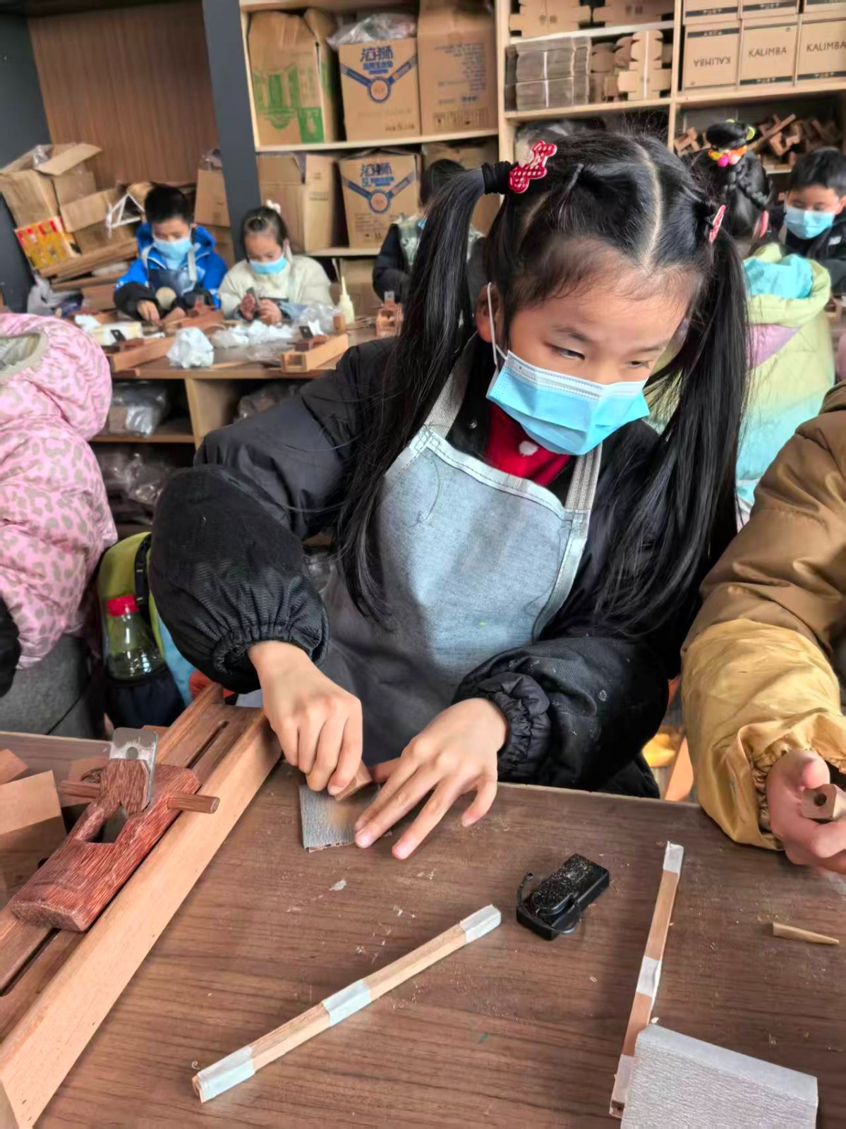 【三四年级】制作“小锯子”。看同学们握工具、做打磨的标准姿势,一招一式有模有样,俨然变身专业的小小木工师傅。