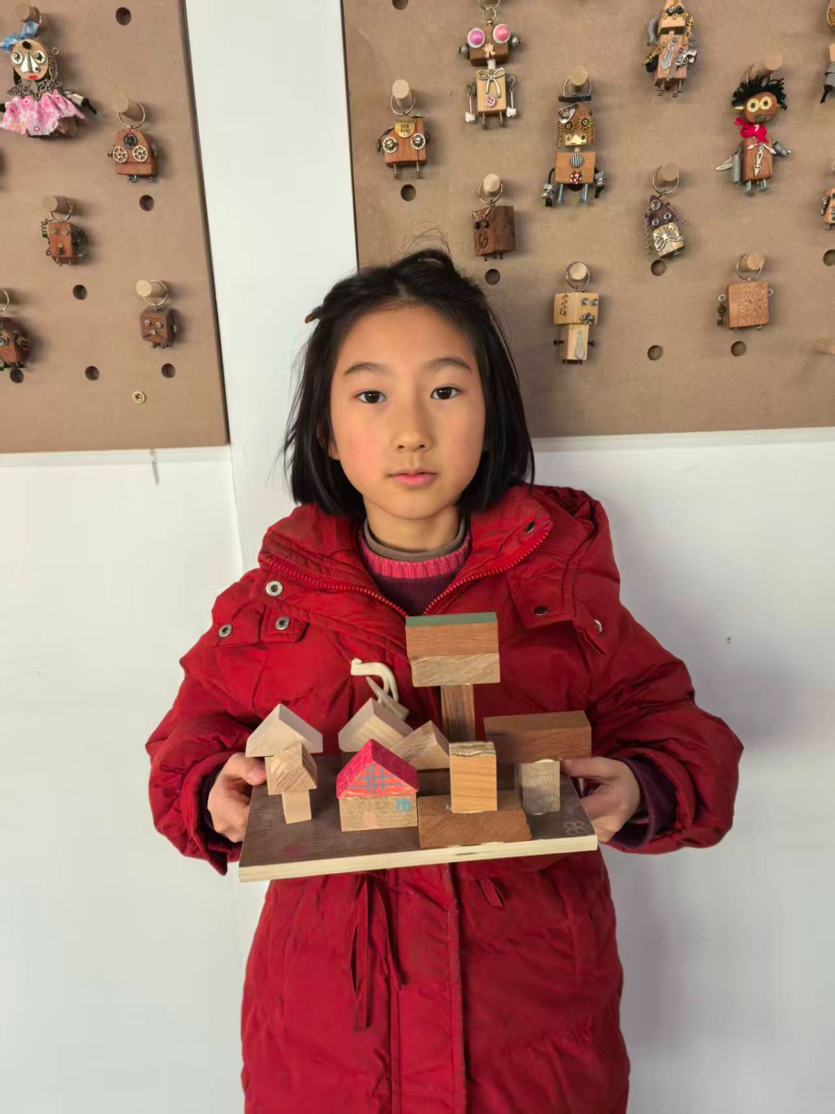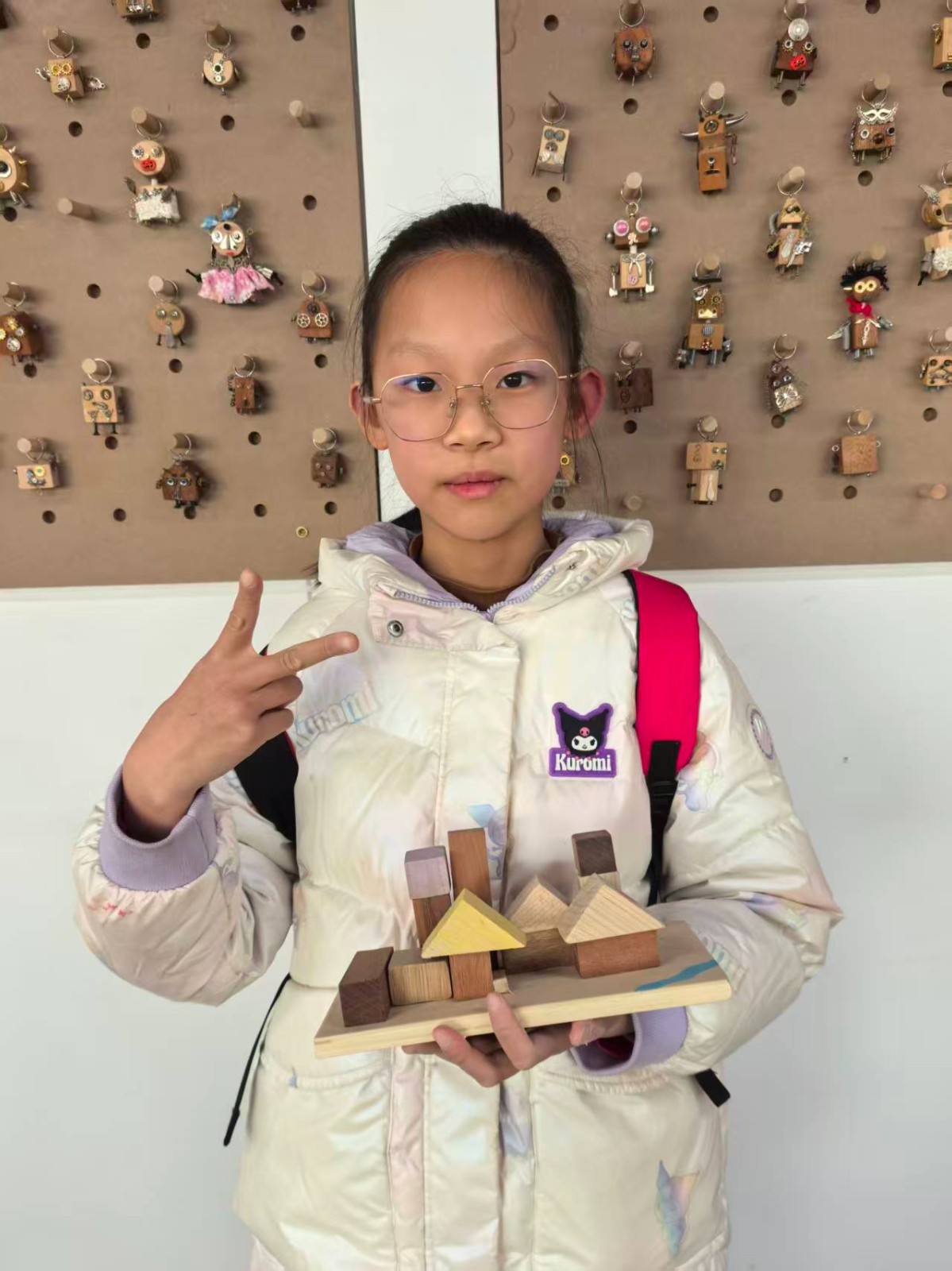 【三四年级】进行“小房子”创意制作。选木块、精细打磨,再用丙烯马克笔为小房子上色,孩子们的巧思让一块块普通木块变成了各具特色的小建筑,拼凑出充满创意的木头小镇。