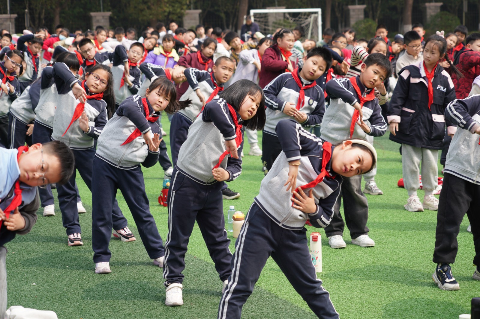 从一年级的懵懂稚嫩到五年级的沉稳干练,各年级组依次登场展示。伸展、弯腰、踢腿、摆臂,同学们动作规范标准,手臂伸直、五指并拢,每一个节拍都精准踩点,每一个动作都整齐划一。整齐的队列、饱满的精神、有力的动作,不仅展现了豫英学子朝气蓬勃的精神风貌,更凝聚着班级的团结与默契。
