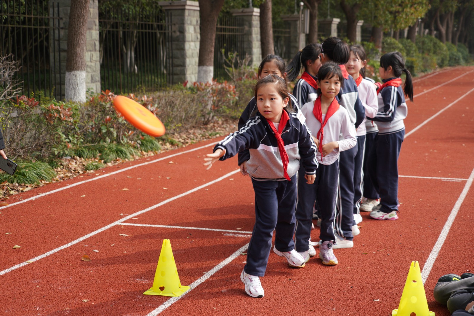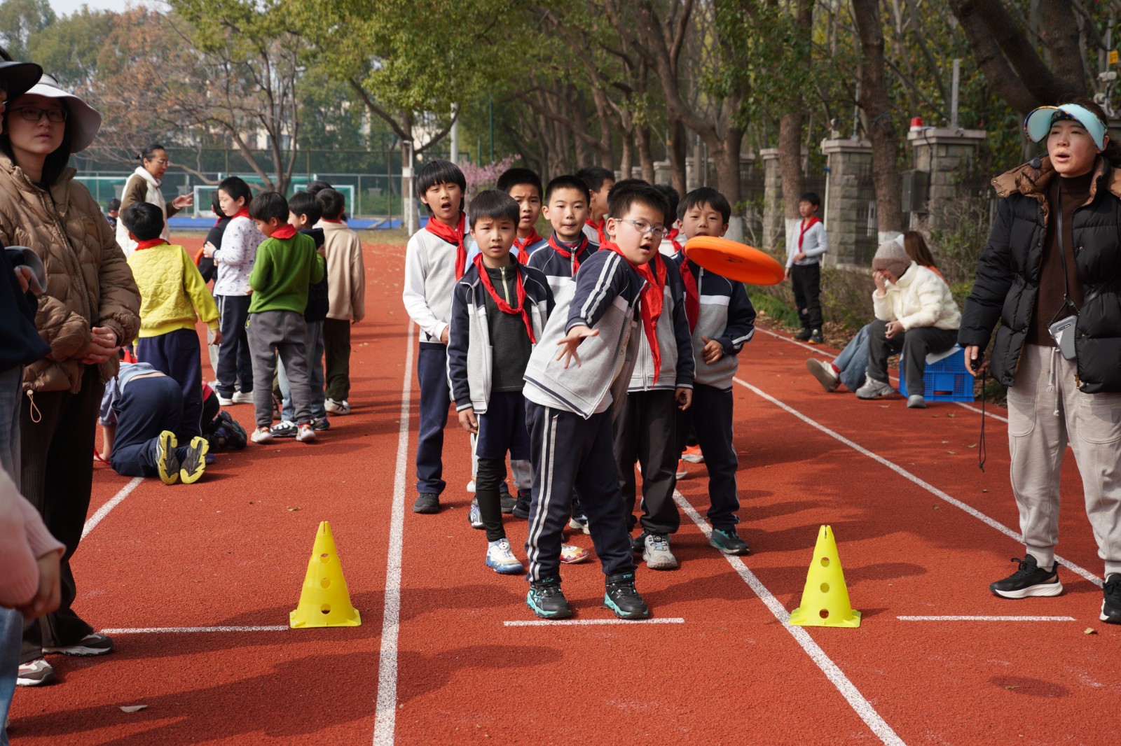 三年级·飞盘传接:跑道东侧,橙色飞盘成为传递快乐与勇气的信使。同学们分列两端、面对面站立,眼神紧紧锁定飞盘,精准传接、默契配合。即便飞盘偶尔落地,大家也毫不气馁,迅速捡起、重新出发,那份执着与坚持,赢得了场边师生的阵阵掌声。