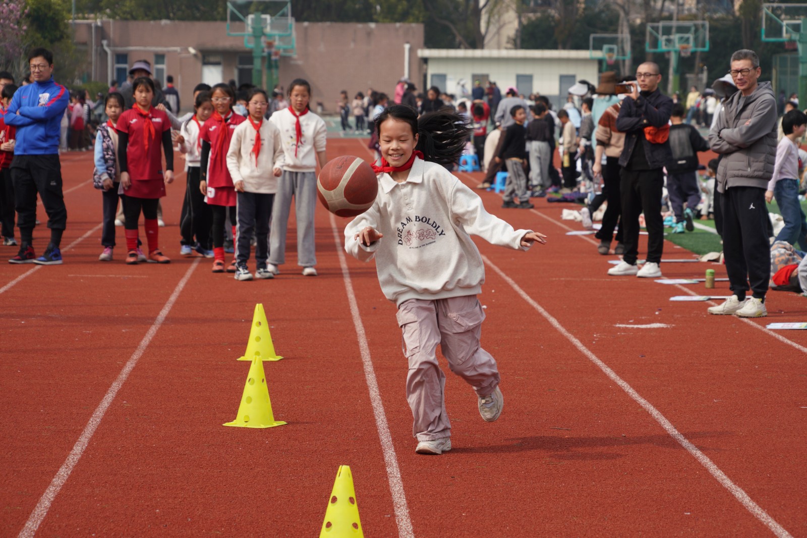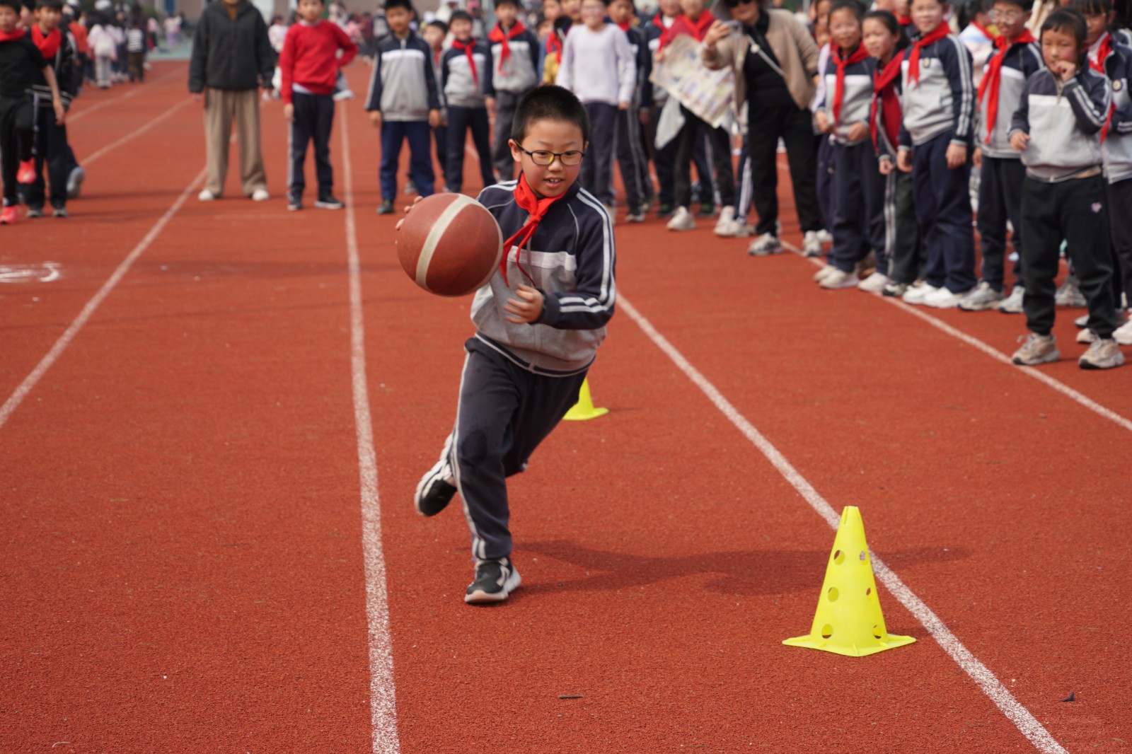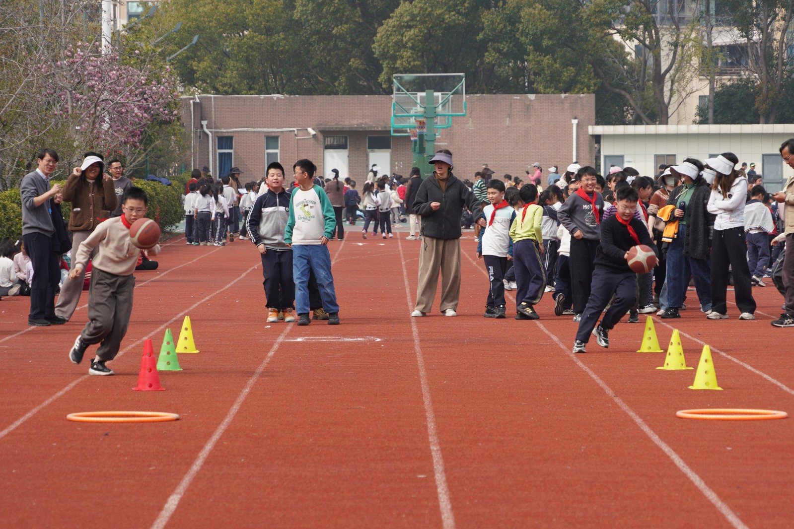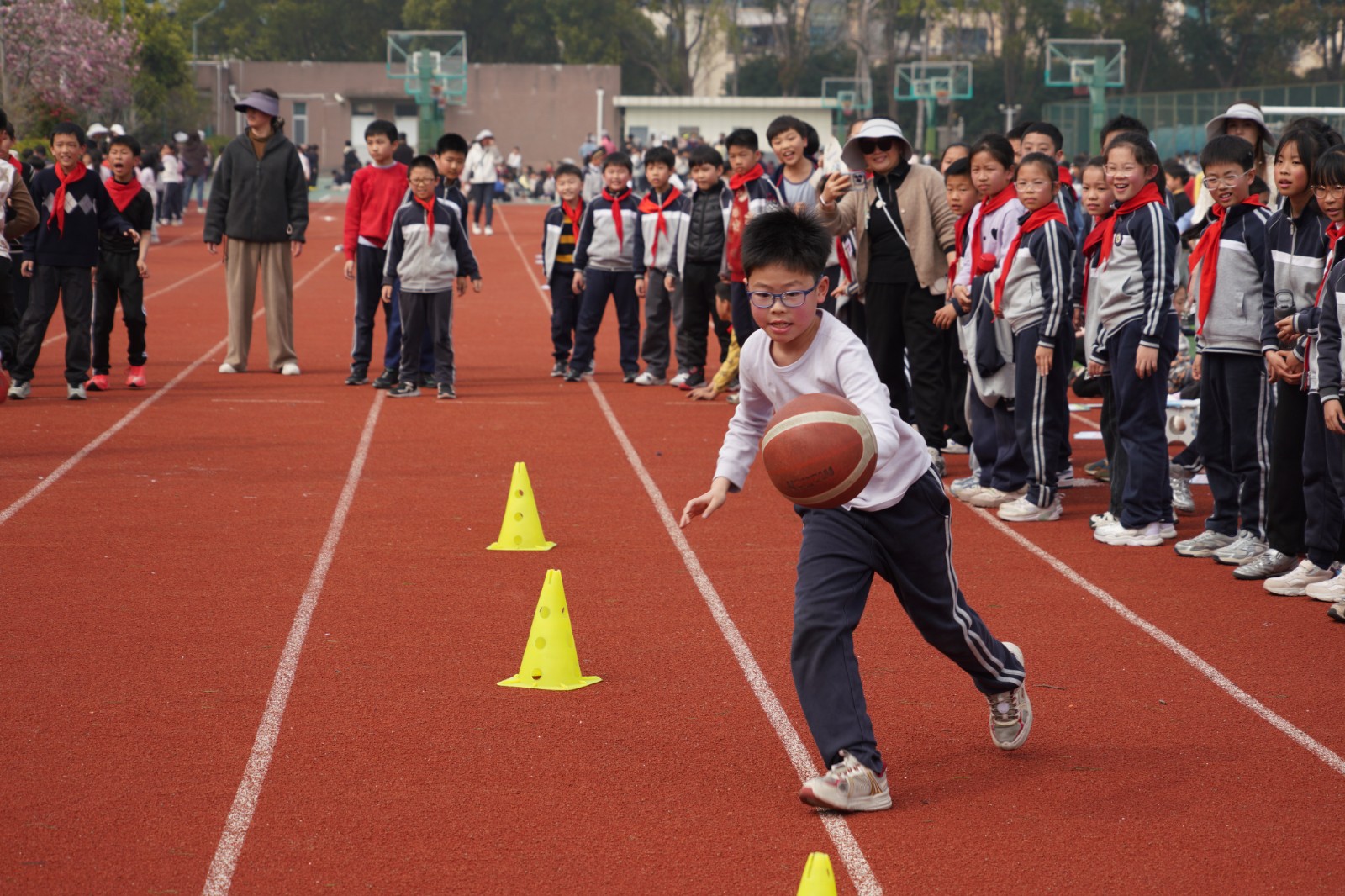四年级·篮球运球接力:司令台旁,篮球运球接力赛更是扣人心弦!小选手们手持篮球,化身灵巧的小燕子,S形灵活绕过标志桶,在呼啦圈内稳稳原地拍球五次后,飞速直线返回。篮球撞击地面的“砰砰”声,与孩子们的心跳同频共振;每一次交接棒,都考验着速度与默契,现场加油声、欢呼声不断,将活动气氛推向高潮。