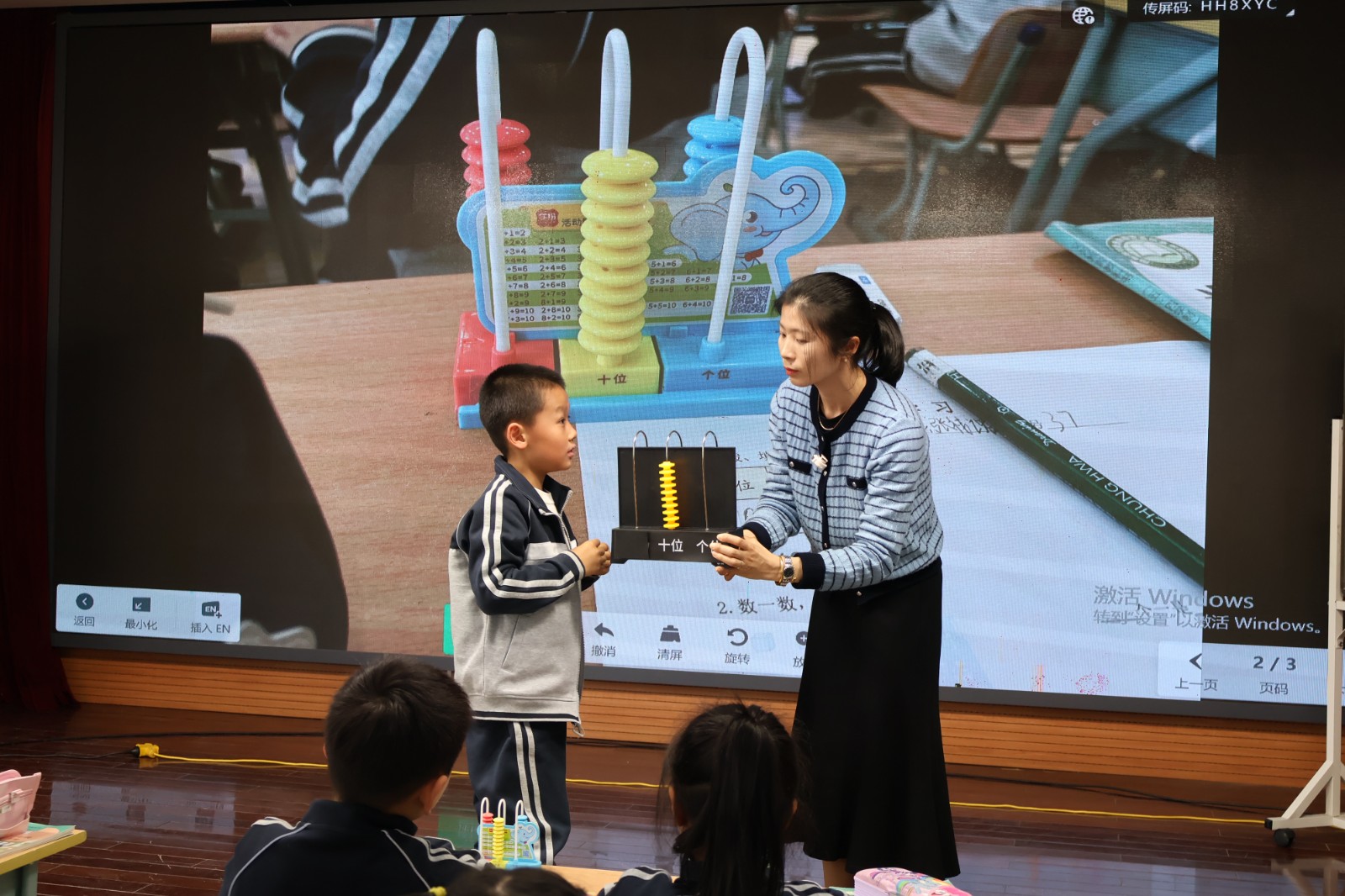 李磊洁老师执教《认识100①》一课。李老师以“99根小棒添1根”为切入点,借助小棒、计数器、数位表,引导学生在“摆一摆、拨一拨、写一写”中直观理解“满十进一”,明晰“10个十是1个百”。课堂融合小正方体模型,帮助学生建构“个、十、百”计数单位的意义,在动手操作中抽象数概念,为后续学习奠定扎实基础。