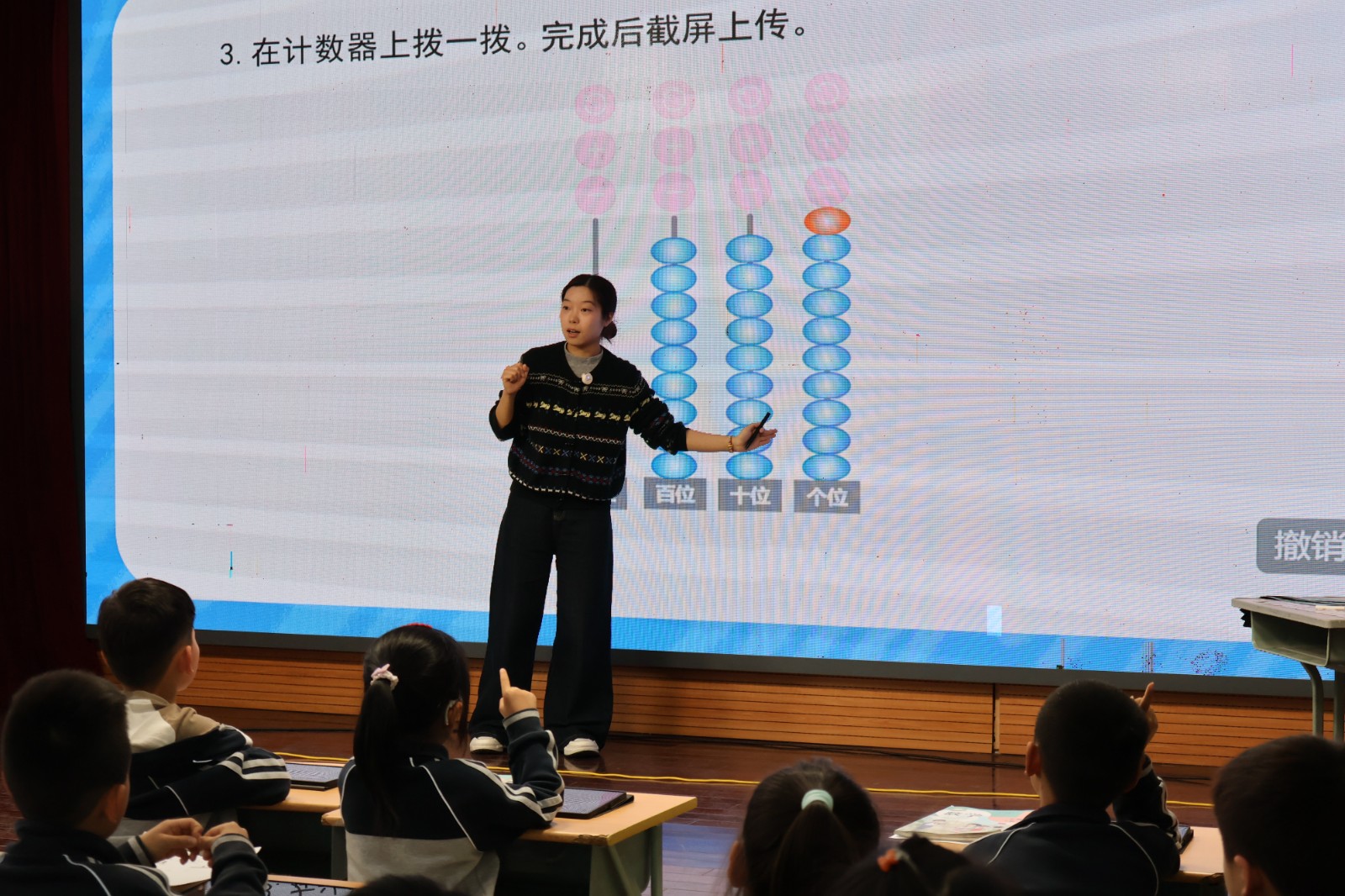 周庭轩老师执教《千以内数的认识①》一课。周老师以体育馆情境导入,自然衔接百以内与千以内数的认知,唤醒学生的十进制经验。课堂以计数器、数位表为载体,通过“999添1”突破连续进位难点,并融入AI教学助手,实现拍照批改、语音对话等即时精准反馈,助力学生自主纠错,展现了青年教师创新教学的风采。