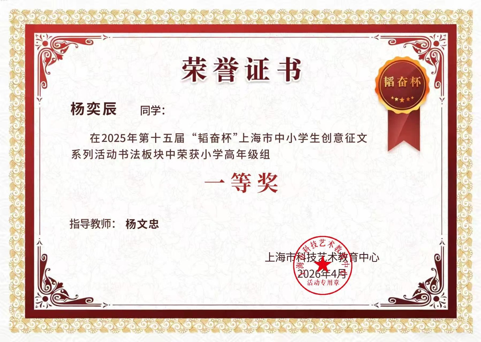 近日,2025年第十五届“韬奋杯”上海市中小学生创意征文系列活动圆满落幕。我校学子在“经典书法”板块凭借扎实功底与文化素养,从全市参赛选手中脱颖而出,斩获多项荣誉。