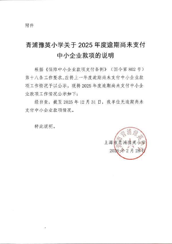 青浦豫英小学关于2025年度逾期尚未支付中小企业款项的说明。