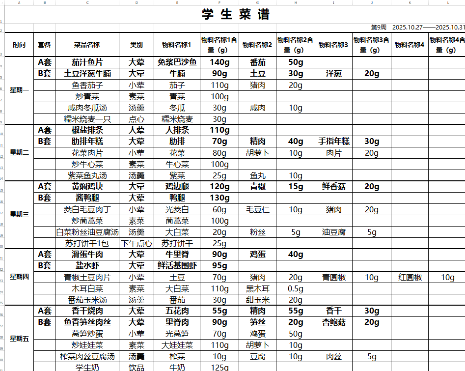 2025学年第一学期御澜湾学校第九周学生午餐清单
