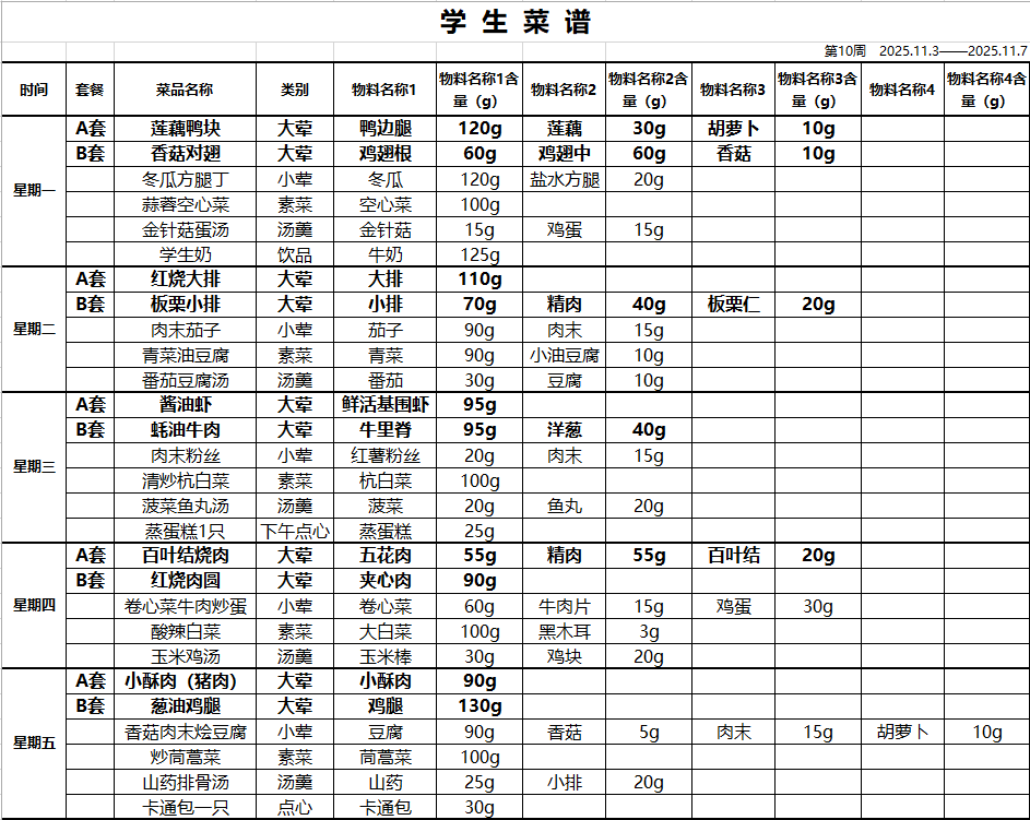 2025学年第一学期御澜湾学校第十周学生午餐清单