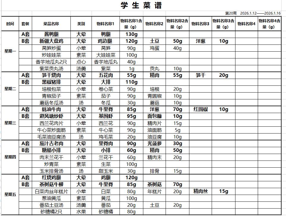 2025学年第一学期御澜湾学校第二十周学生午餐清单