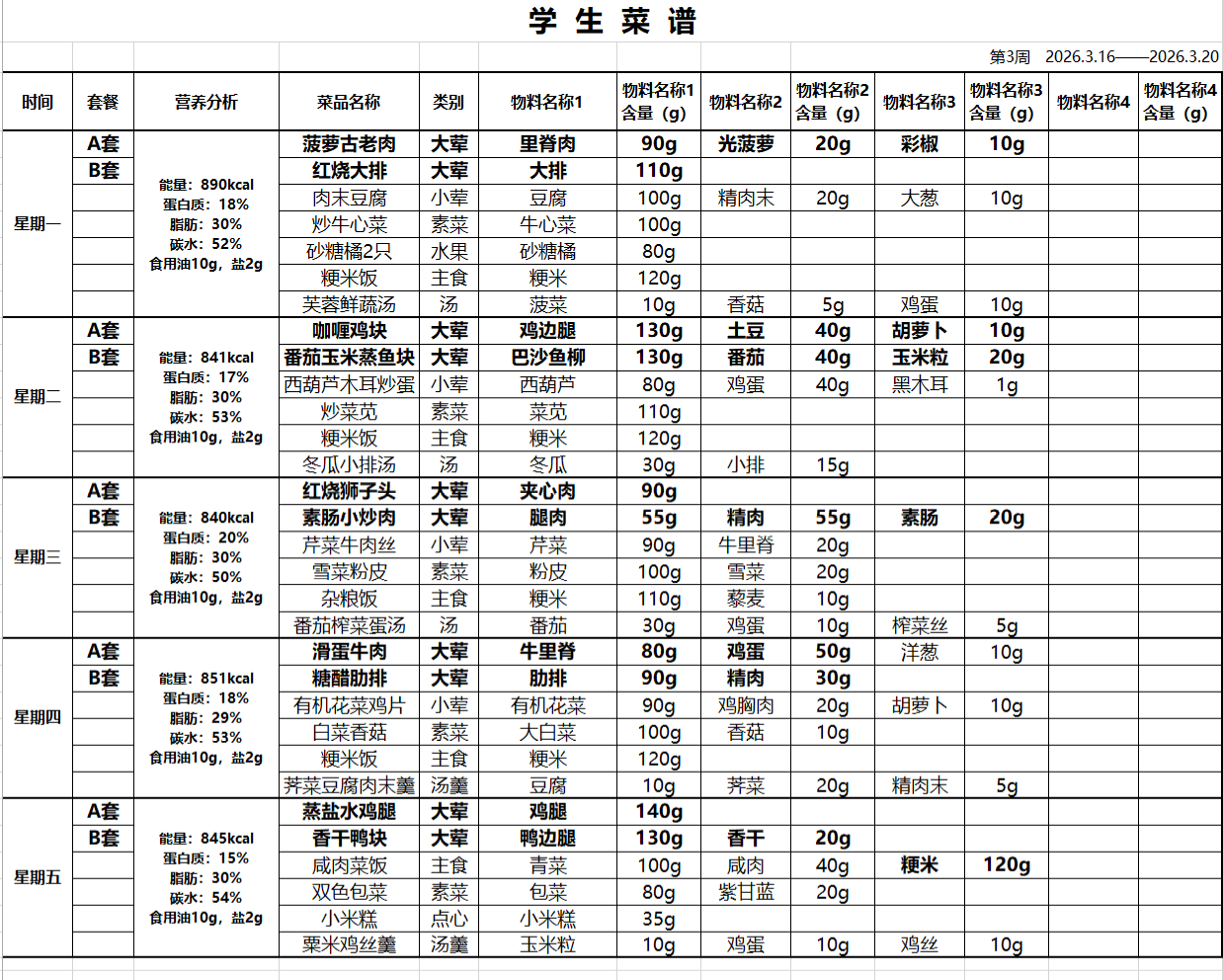 2025学年第二学期御澜湾学校第三周学生午餐清单