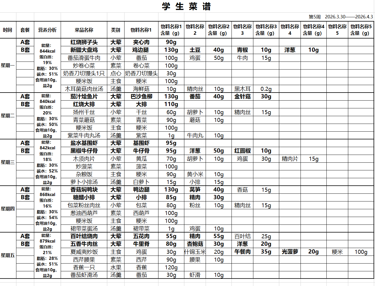 2025学年第二学期御澜湾学校第5周学生营养午餐菜谱