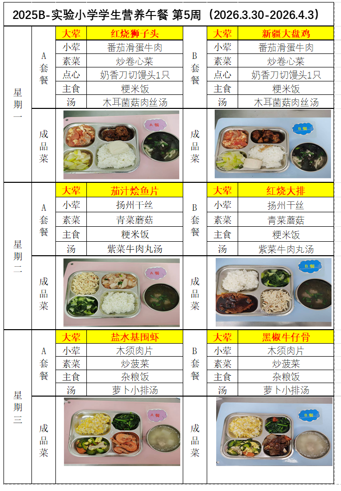 2025学年第二学期豫英小学学生营养午餐菜谱(第6周)